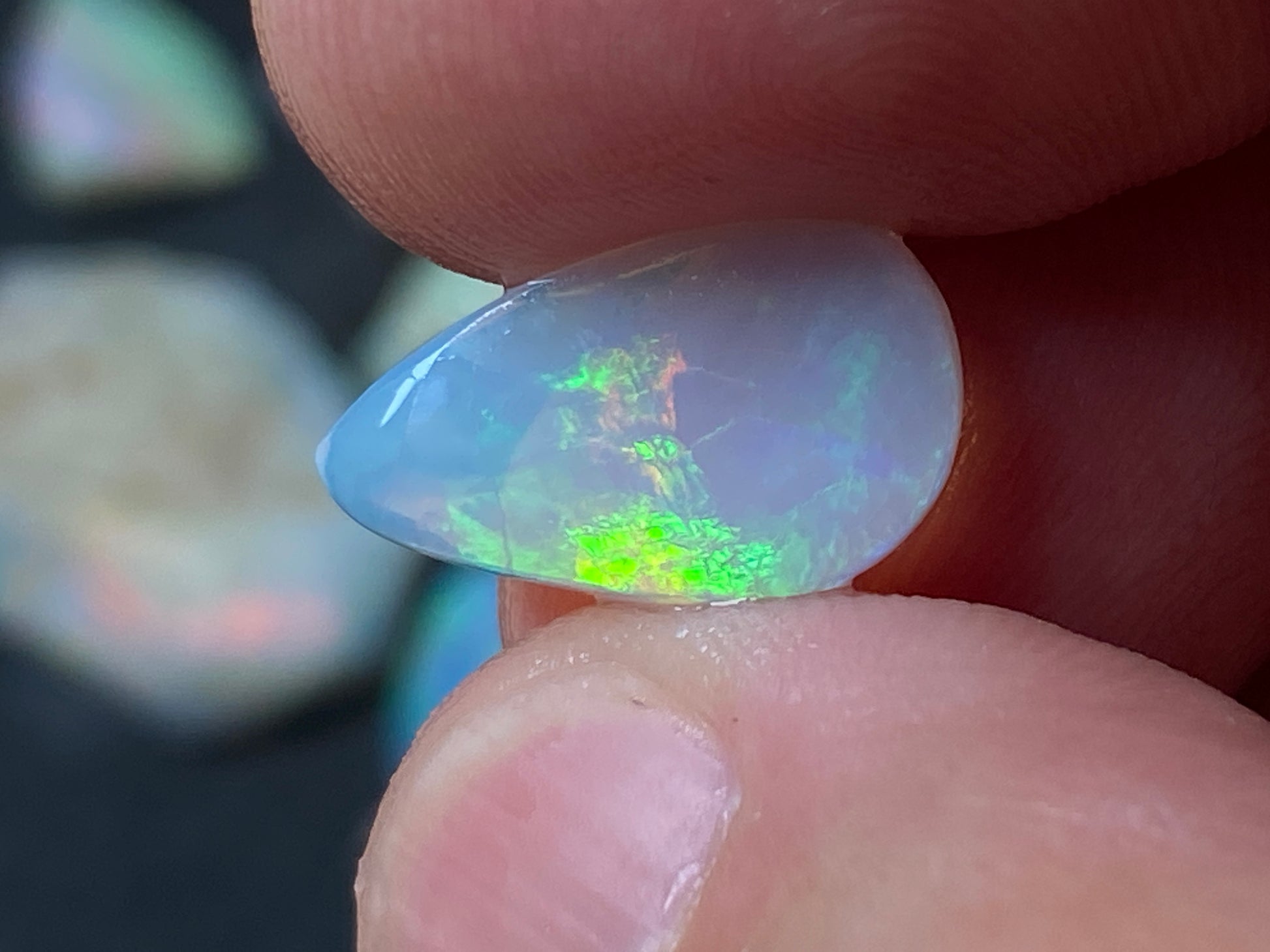 110 Carats Natural Australian Opal Parcel, Rough and Rubs, 8 Stones, 17 Mile Field. This is great value with low risk. The rubs are already paying for the parcel. There is 18 Carats of them. Over 90 carats of rough with one stone being 45 the other 2 over 20 and a small piece that i just threw in as it has a nice colour to make a little gem. Reds and greens are the dominant colours. The 6.5 carat rub is the star of the show flash is very bright with gold, orange and green. These are crystal and white opal. The rough looks really promising. It all comes from the same parcel which had very little cracks and bright colours. Great value for multi gem parcel from Coober Pedy.