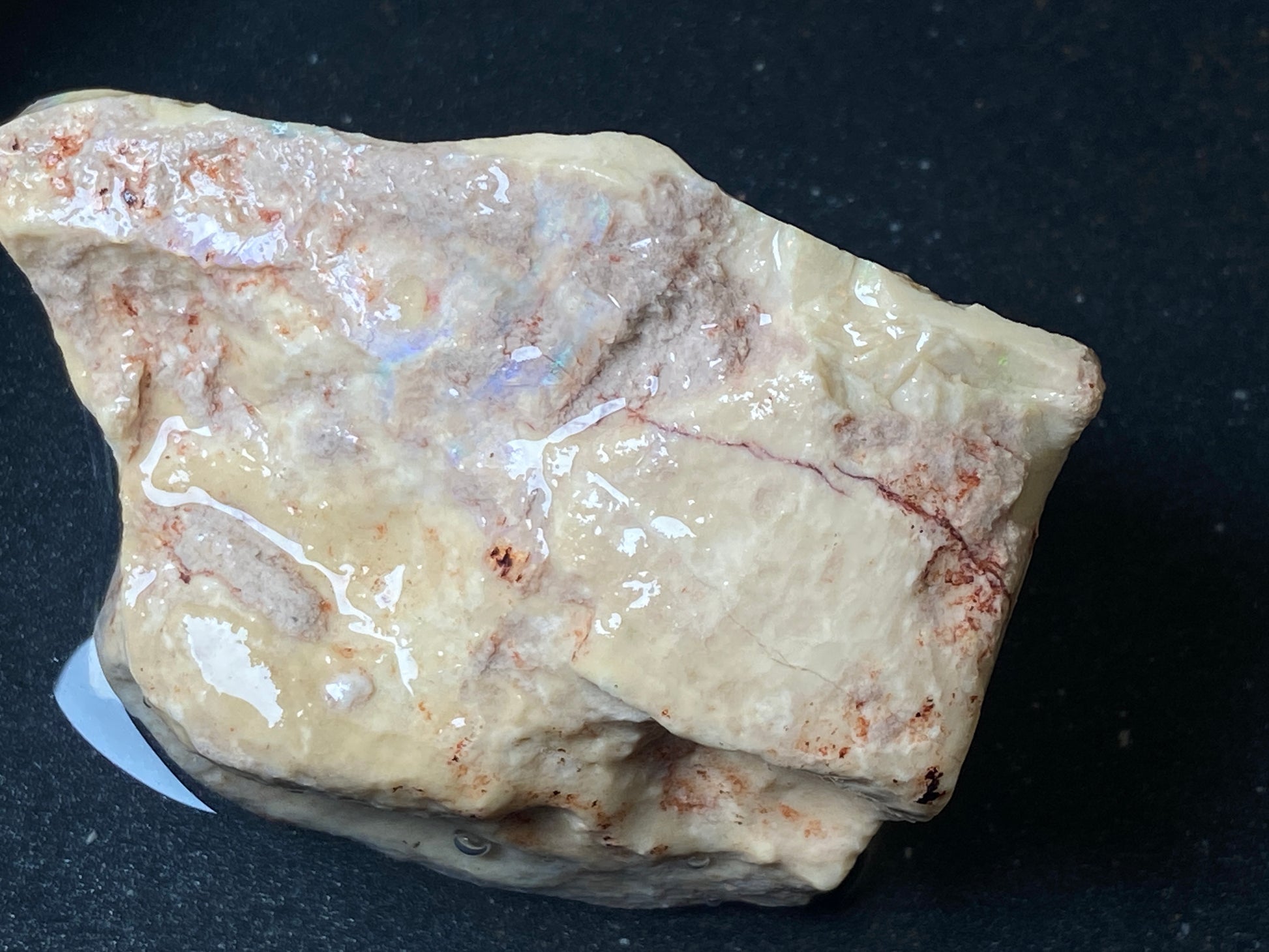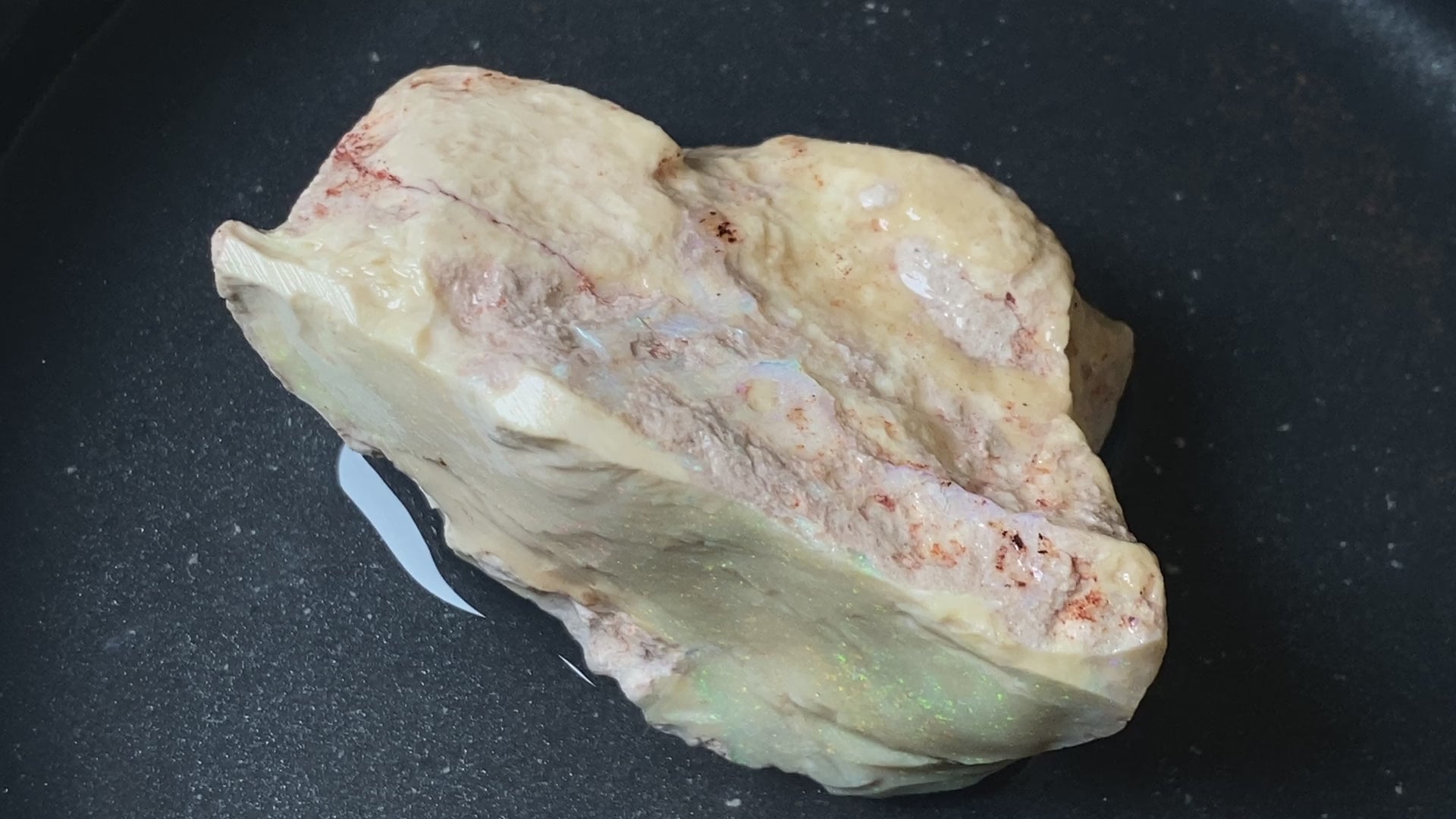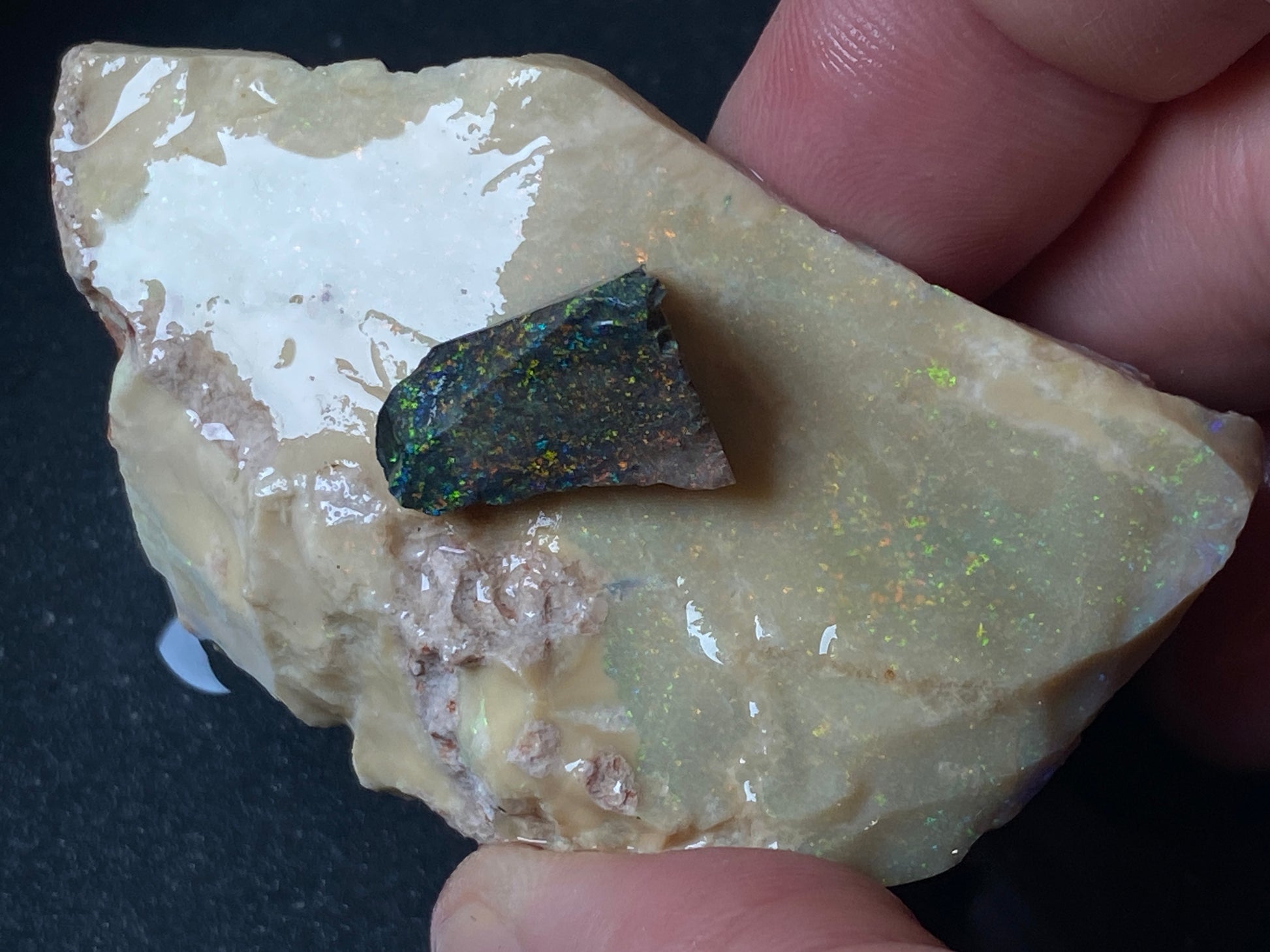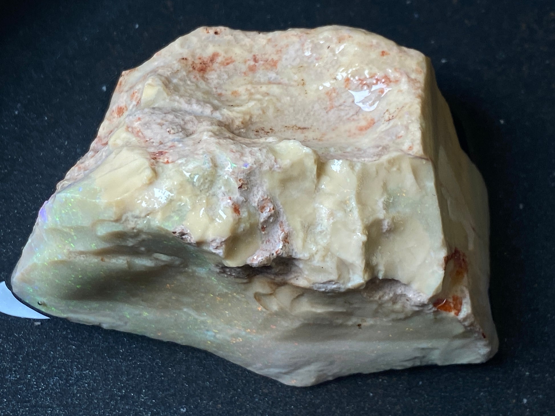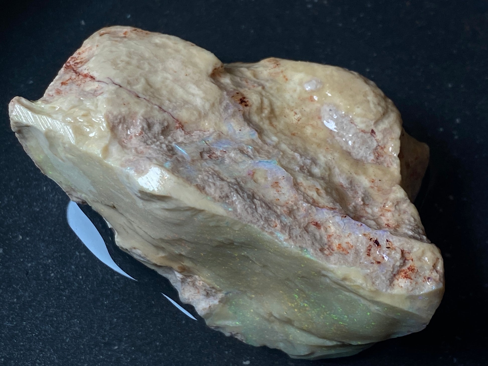 2.9oz, Andamooka Matrix Opal, In The Rough, Huge Stone With Amazing Colours. This should treat very well and bring out those reds and greens that feature throughout this huge piece. There is a little test piece with it and you can see how the colours pop. Huge specimen or dozens of awesome gems. You can make so much money here .