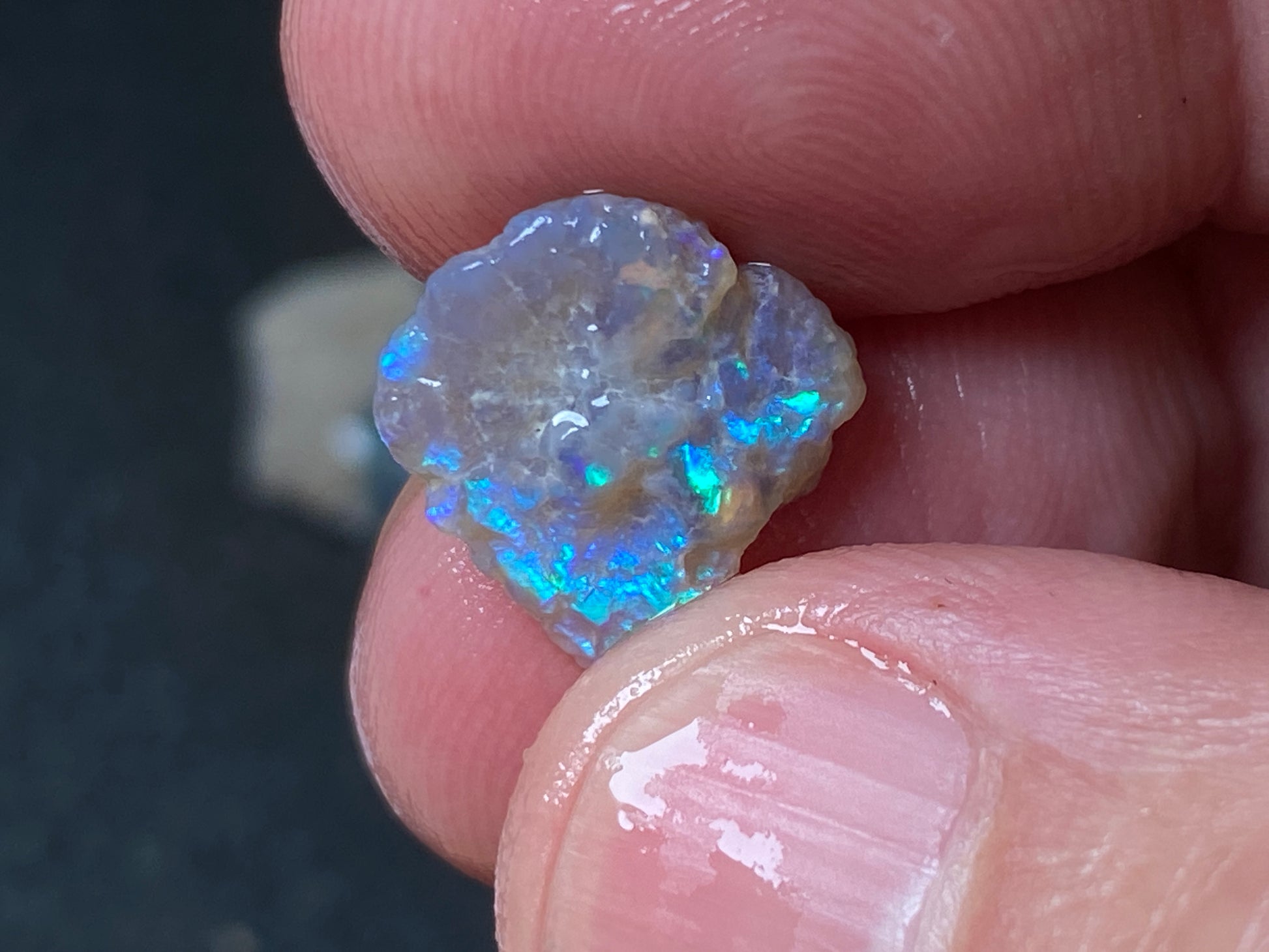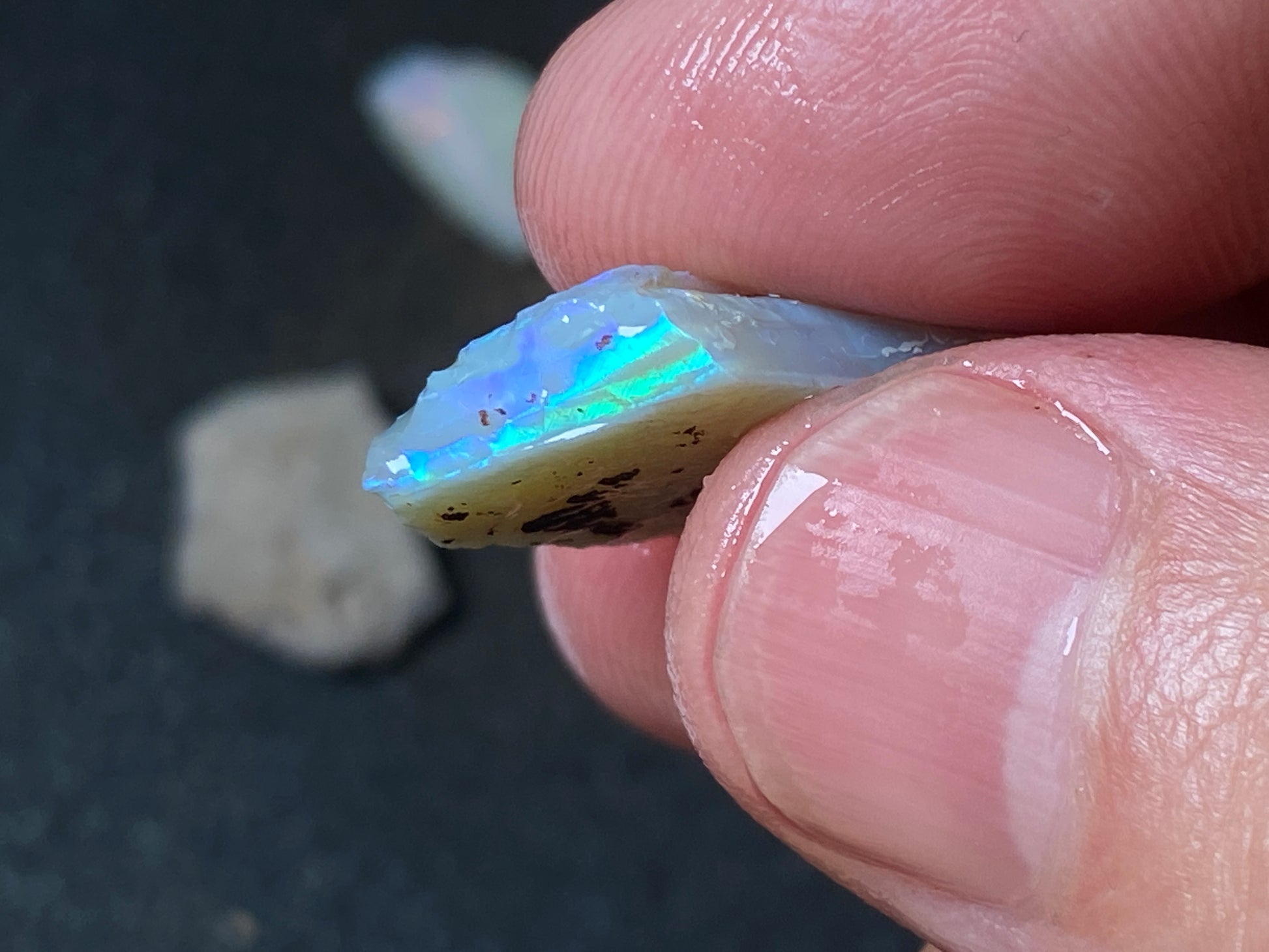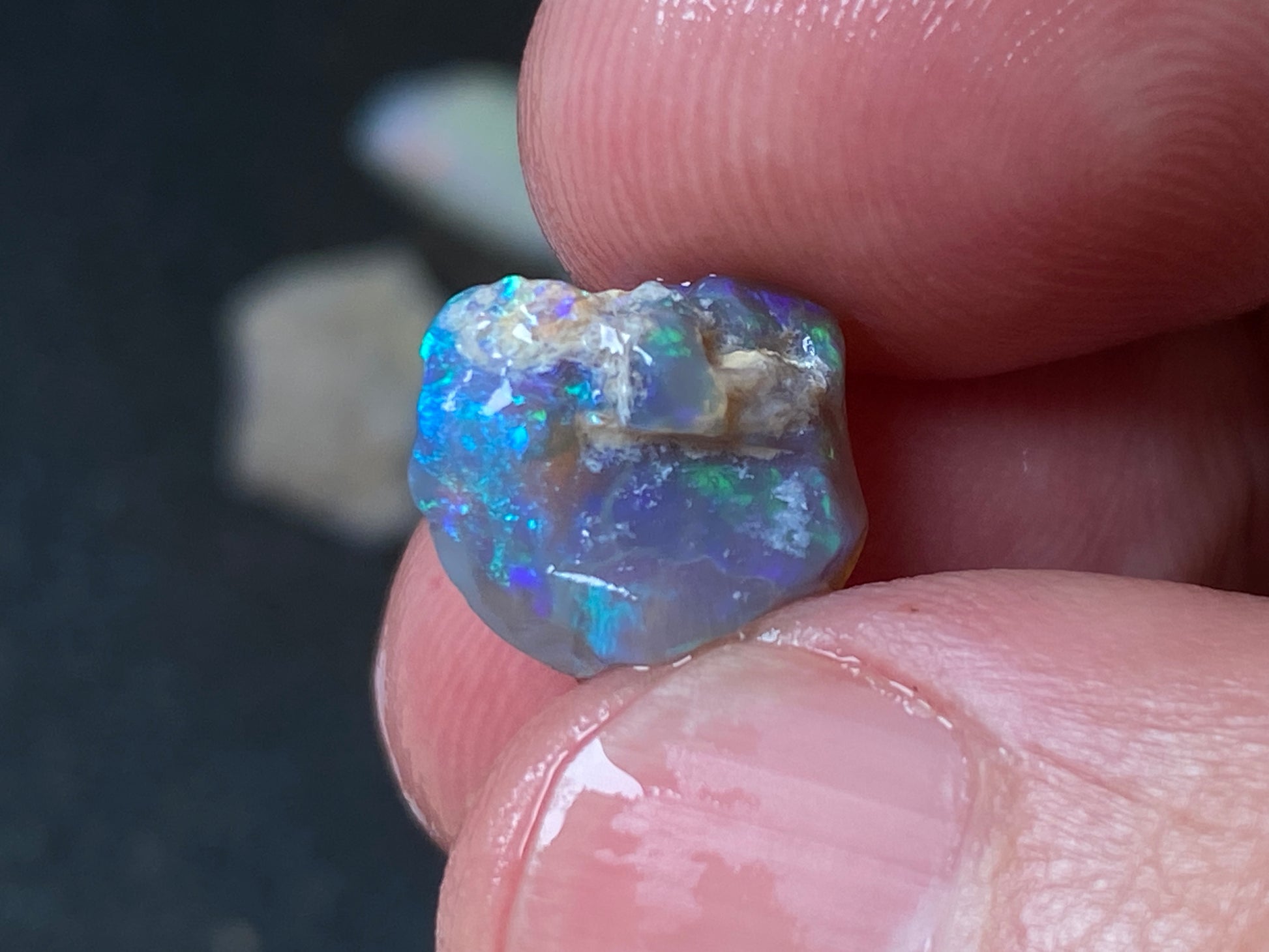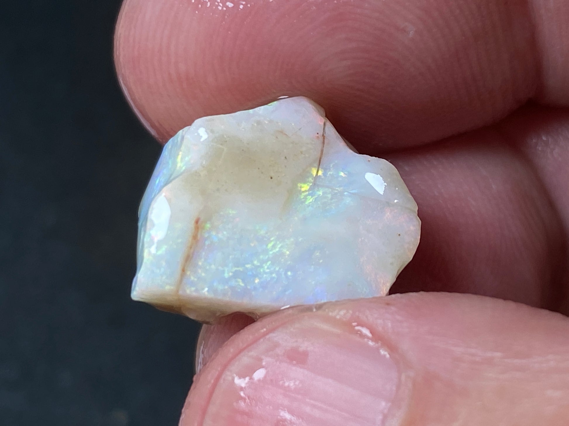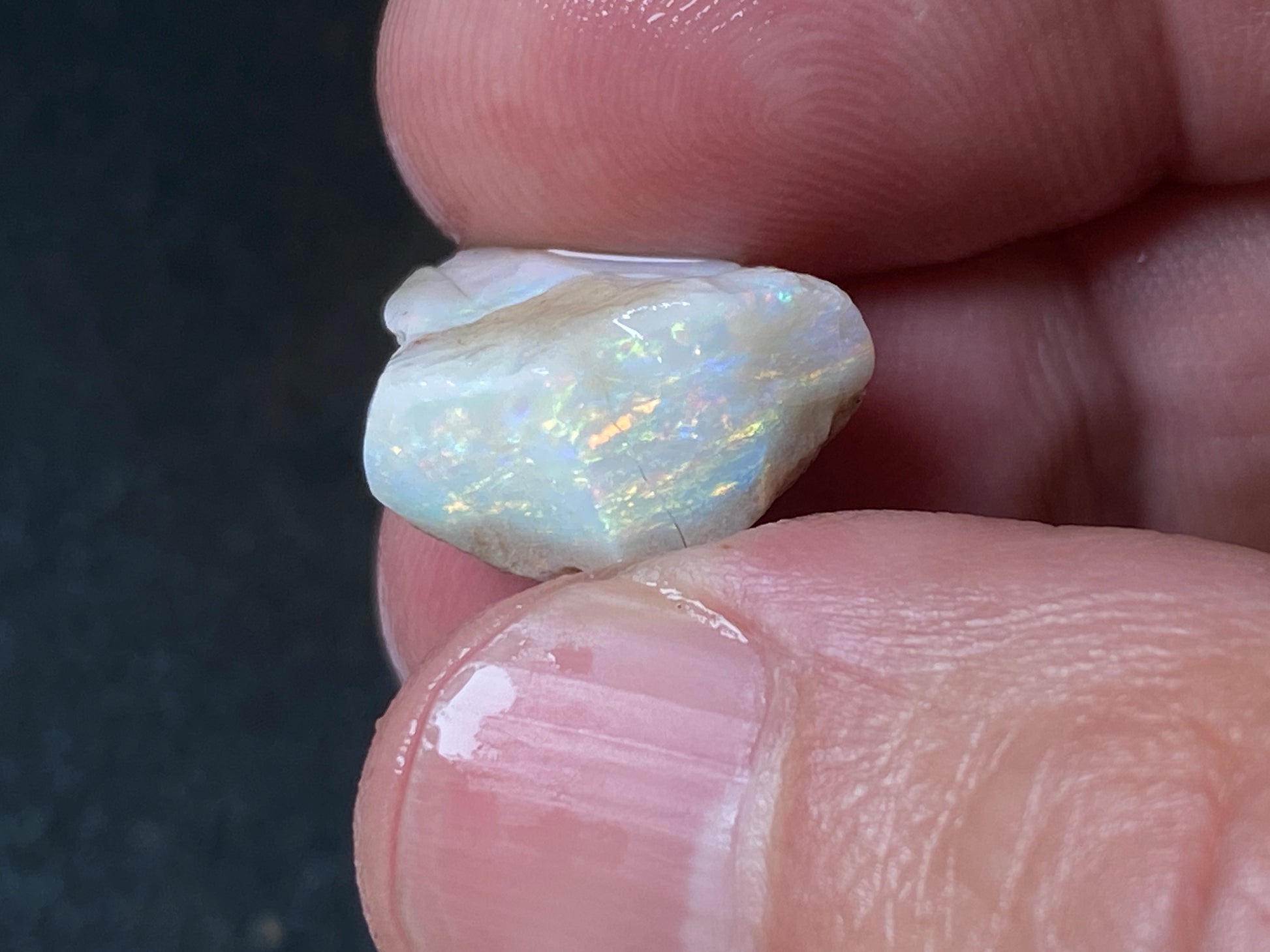 70 Cts, Natural Australian Opal Parcel, 13 Stones Lightning Ridge In The Rough. Crystal and black opal also some light and grey cutters. All colours some very bright. Couple of the stones cut will pay for the parcel. I feel you make good money on it as there is a possible cutter in every piece. Specially the crystal bars are amazing. The big black piece doesn't have clear bar just specs of colour on one side probably the worst piece in this beautiful and awesome parcel for the money.