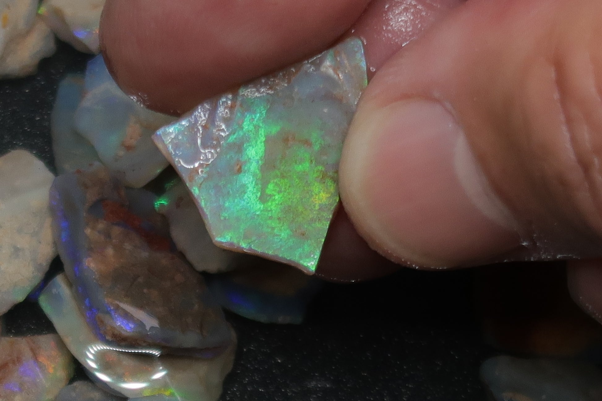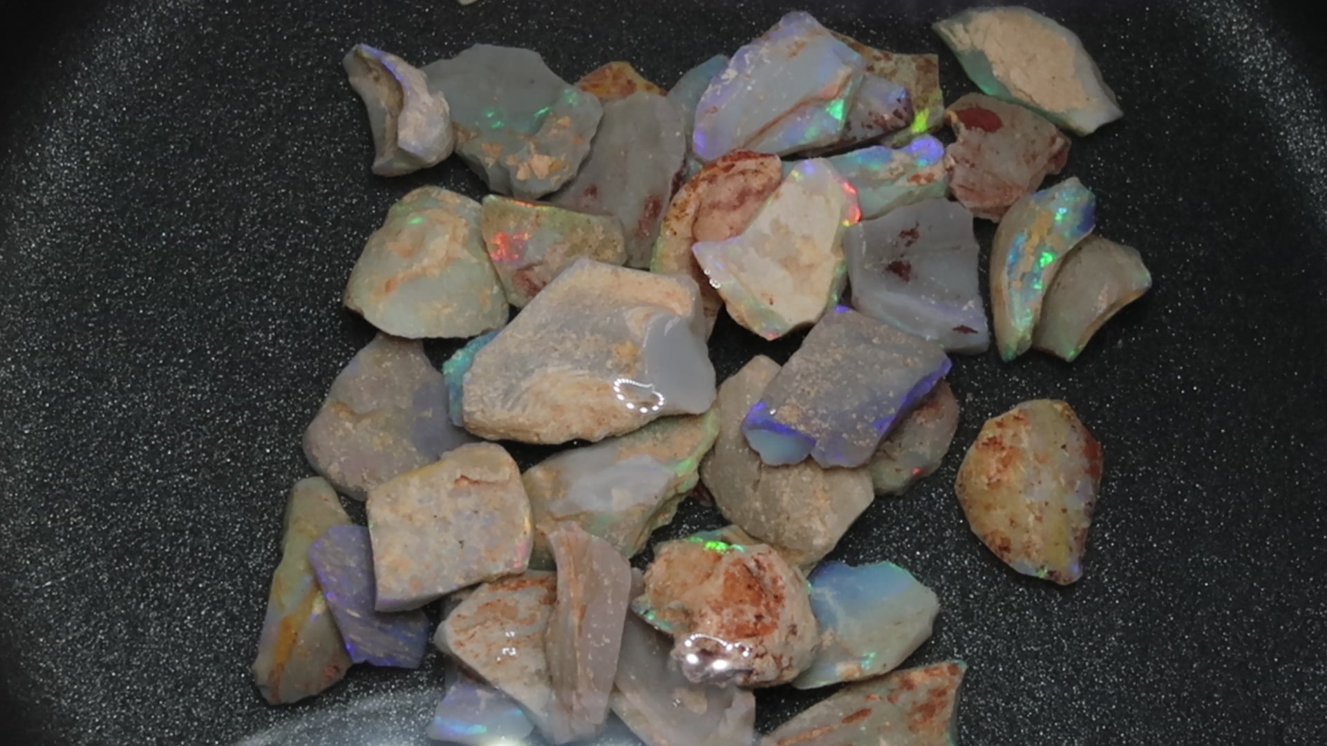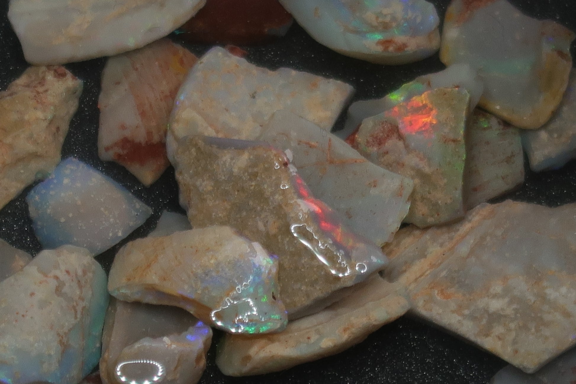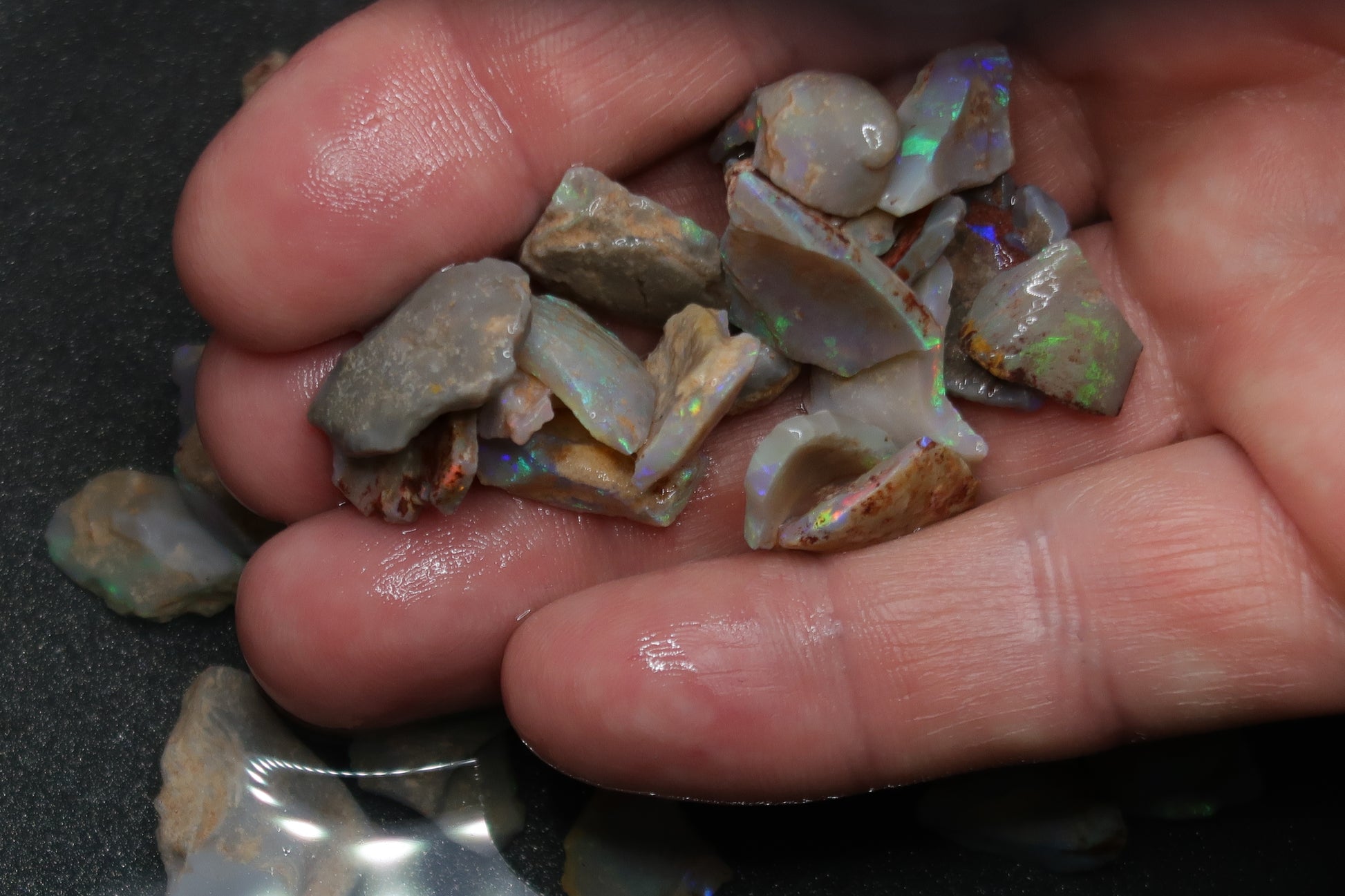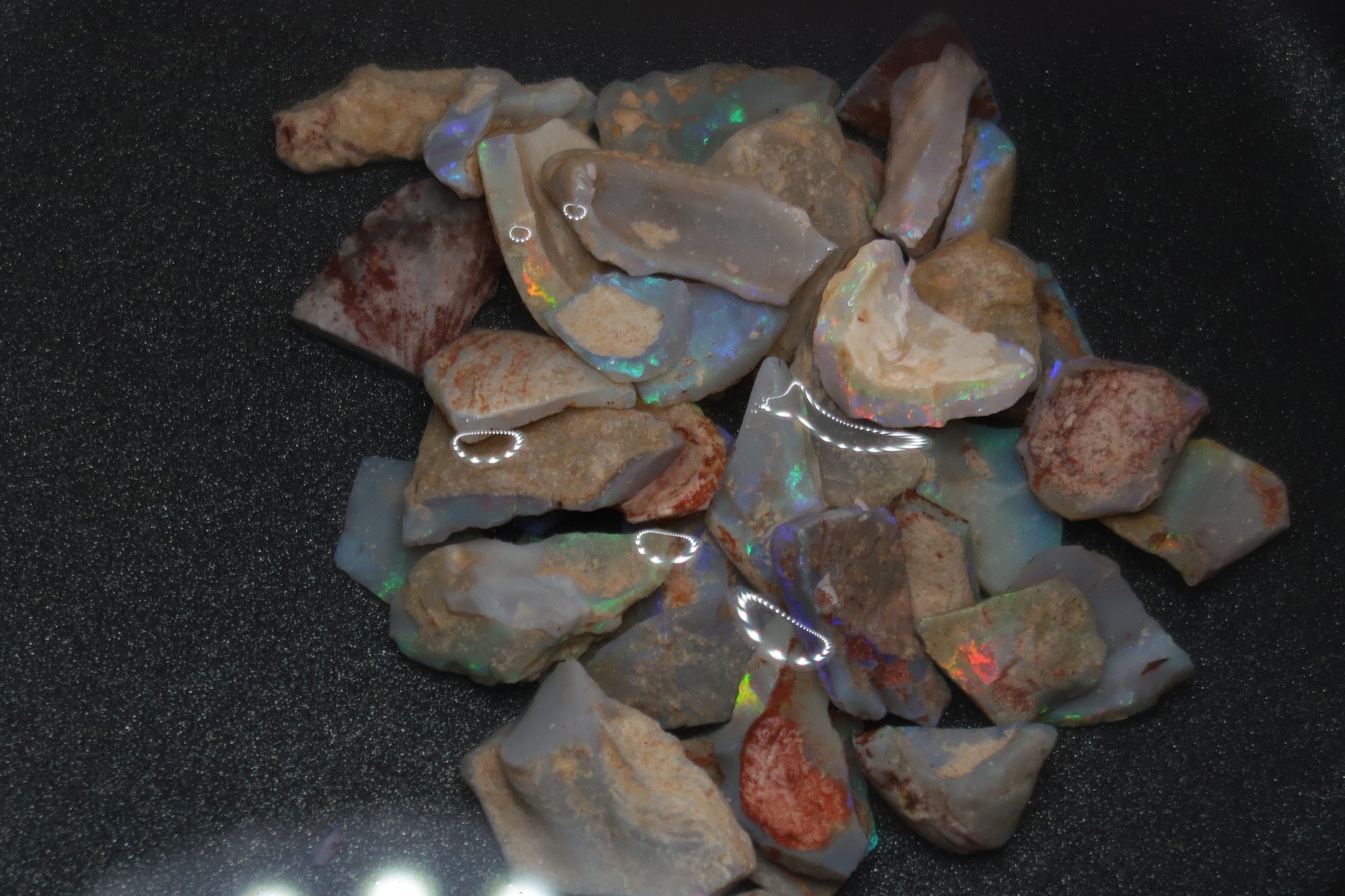 1 盎司天然澳大利亚蛋白石包裹,原石、深色底座中的贝壳碎片。绿色、蓝色和一些红色。这并不容易得到。深色的彩色贝壳碎片。我喜欢这种材料。