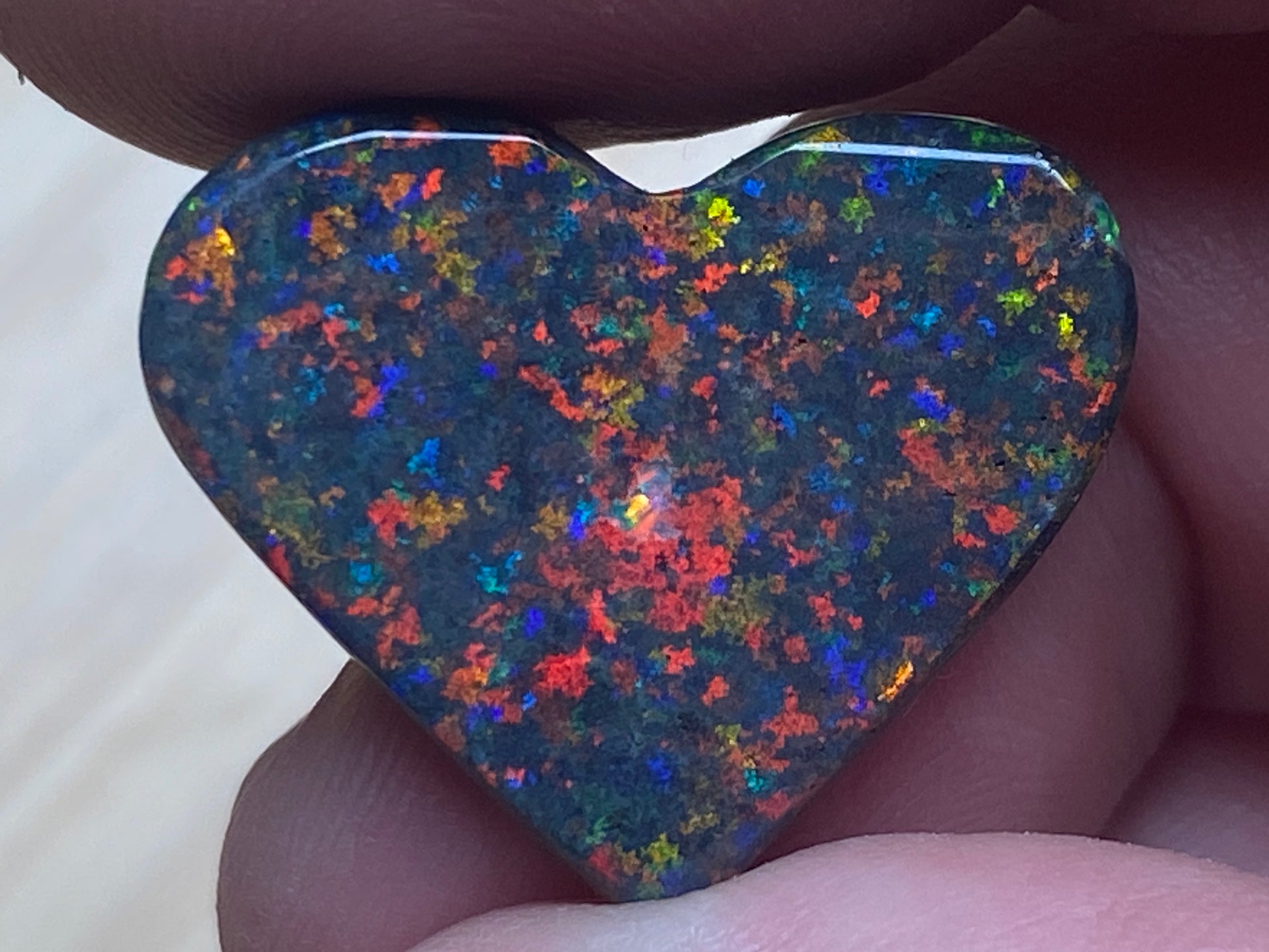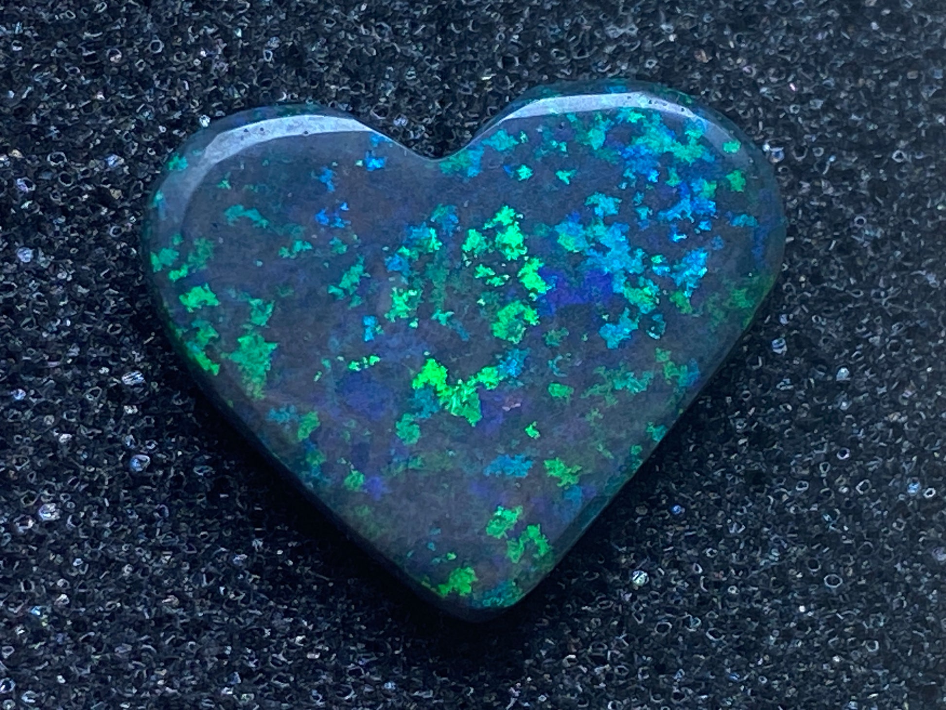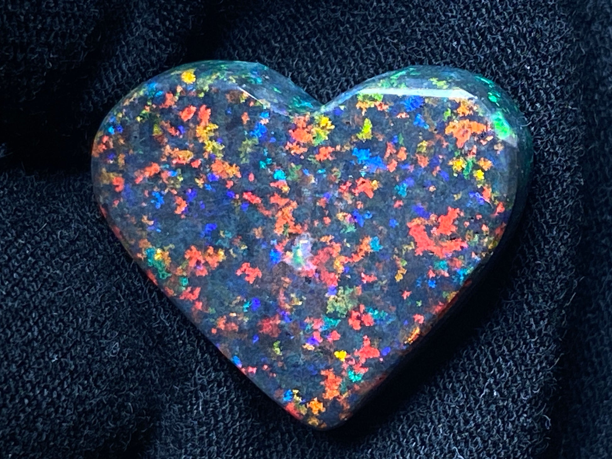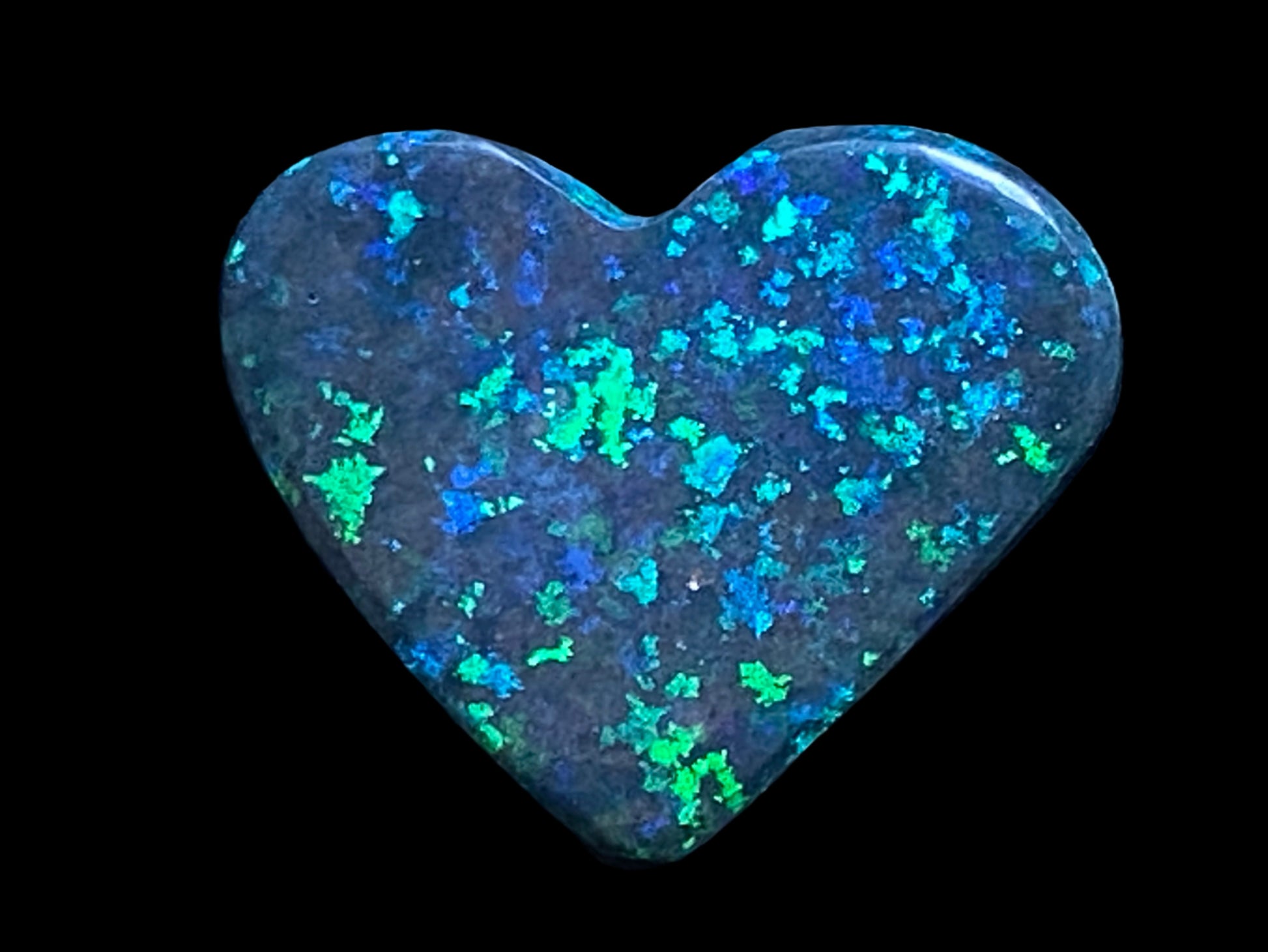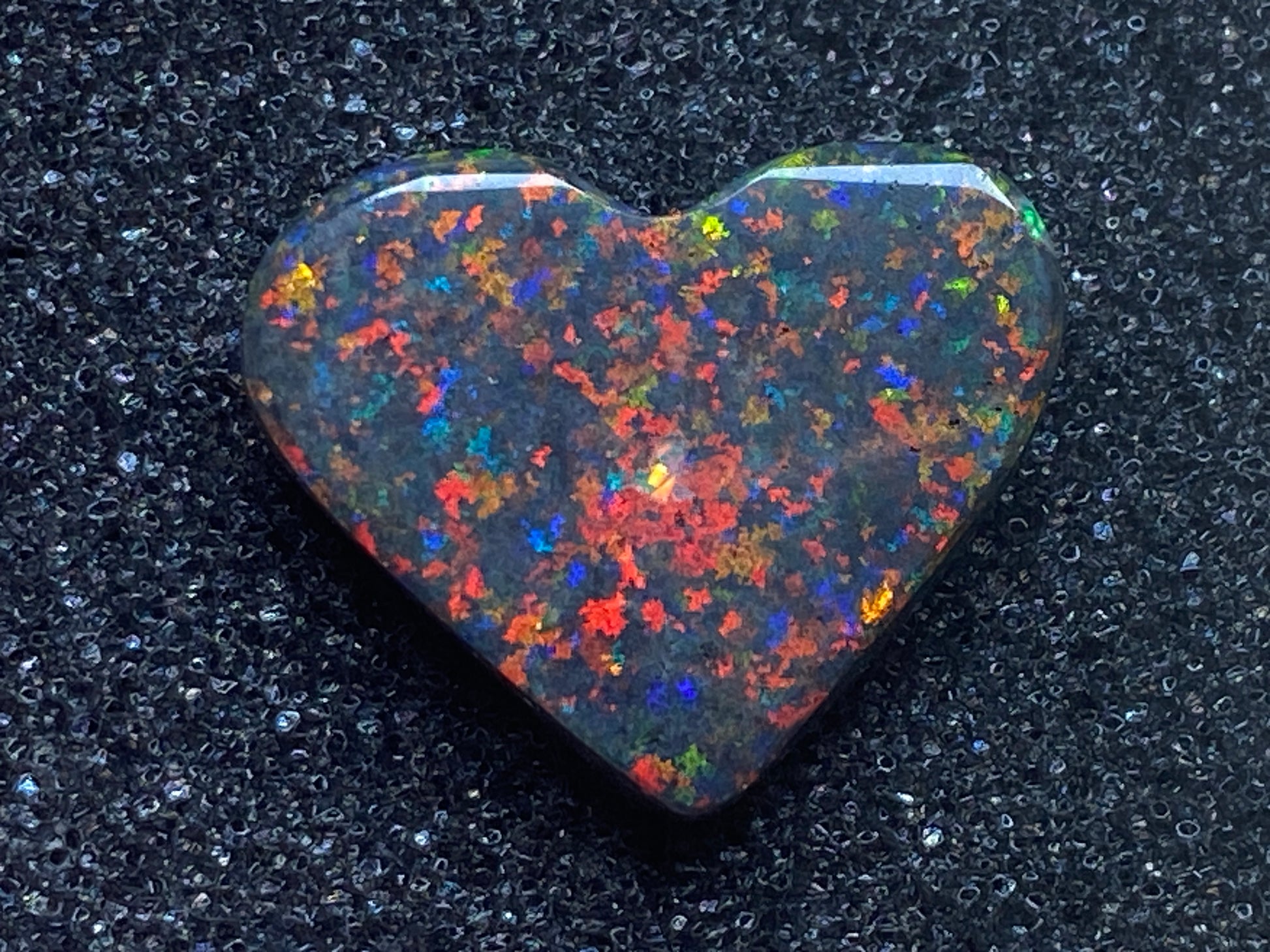 13 Carats, Black Andamooka Matrix Opal Heart, AAA Grade, Ready To Set, Double Sided Bling. Magnificent rainbow of colours. Super bright. 22x18x4.8mm. It is truely a show off piece hard to pick which side is better the red or the blue green. This is as good as Matrix opal gets. Photos don't do it justice.