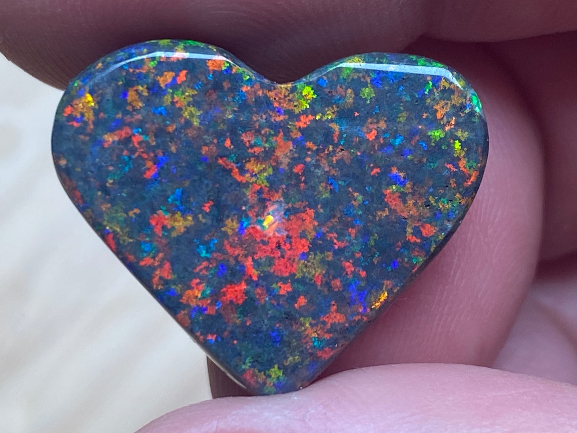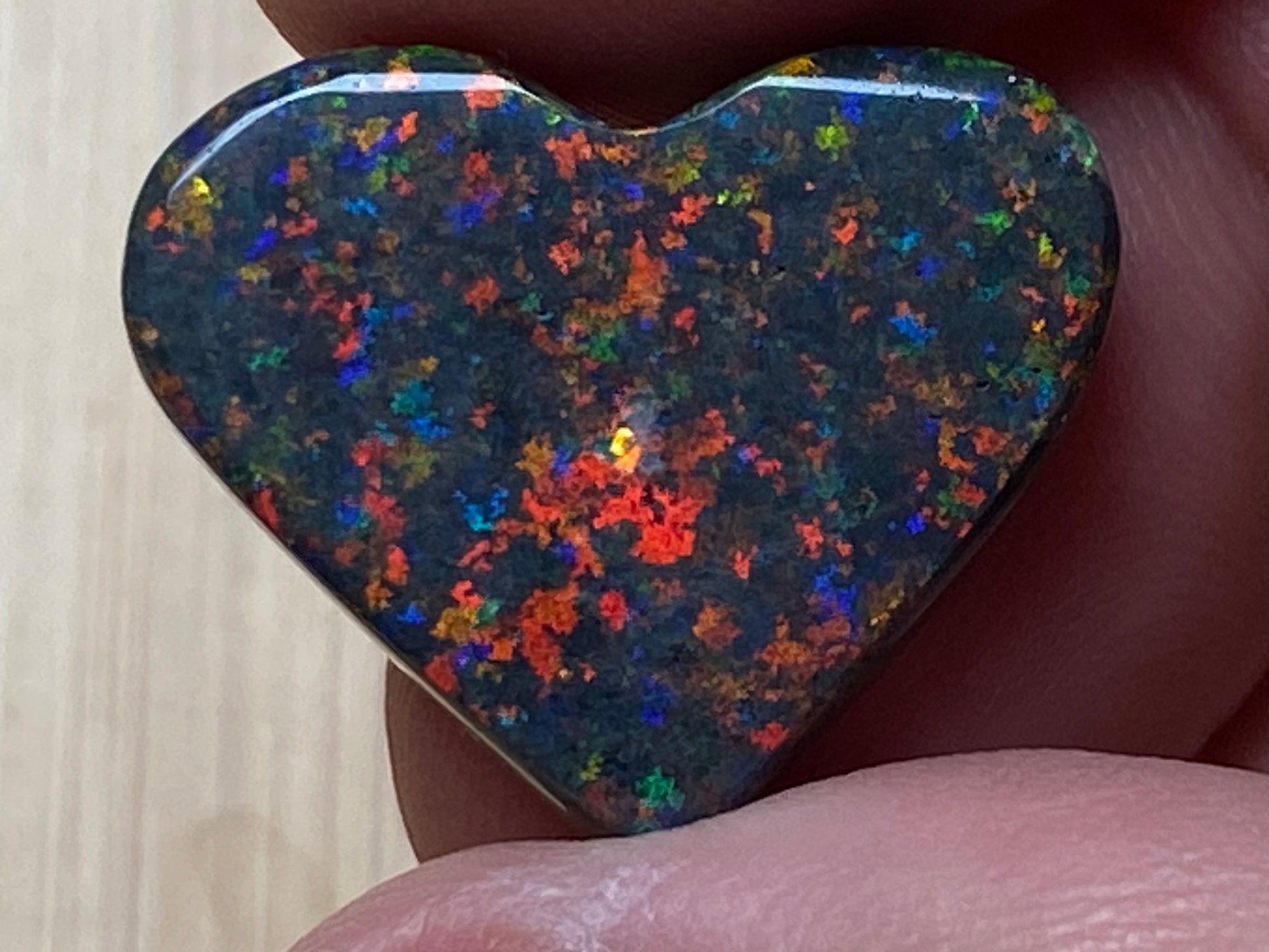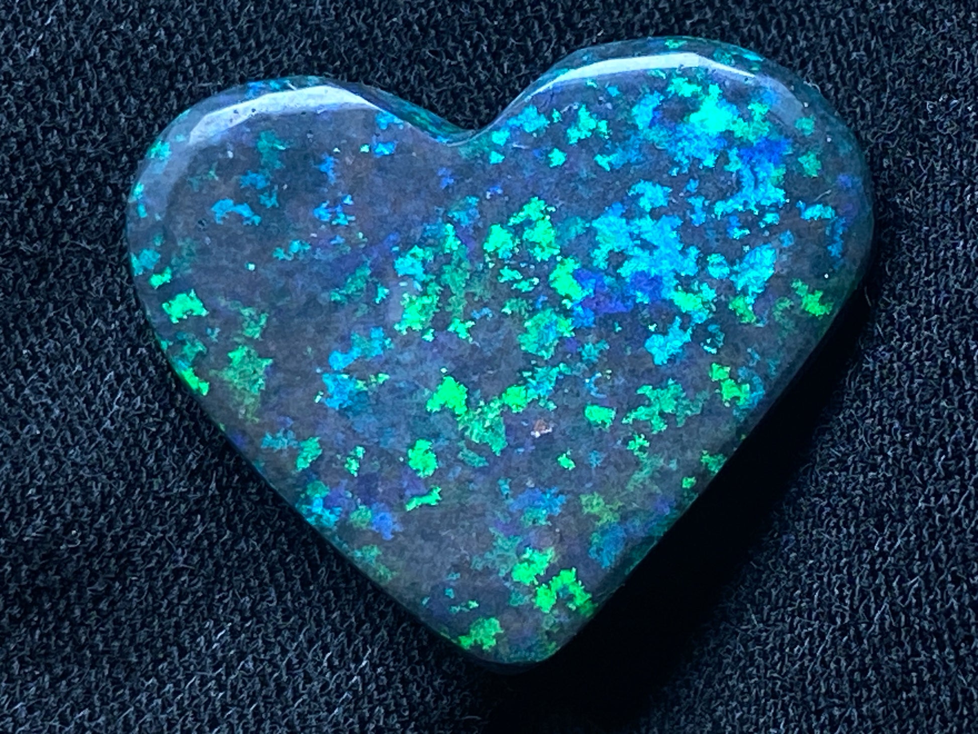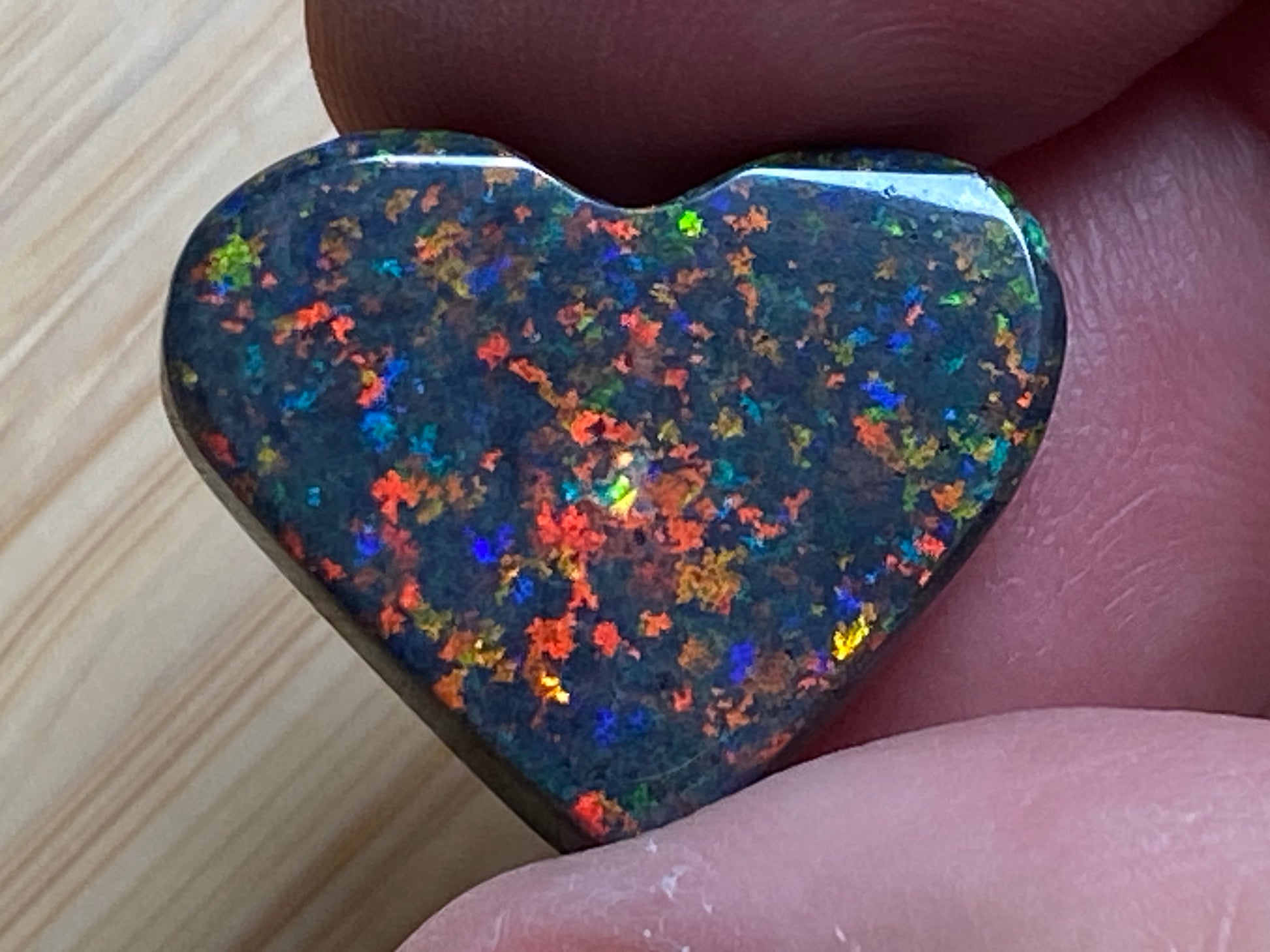 13 Carats, Black Andamooka Matrix Opal Heart, AAA Grade, Ready To Set, Double Sided Bling. Magnificent rainbow of colours. Super bright. 22x18x4.8mm. It is truely a show off piece hard to pick which side is better the red or the blue green. This is as good as Matrix opal gets. Photos don't do it justice.