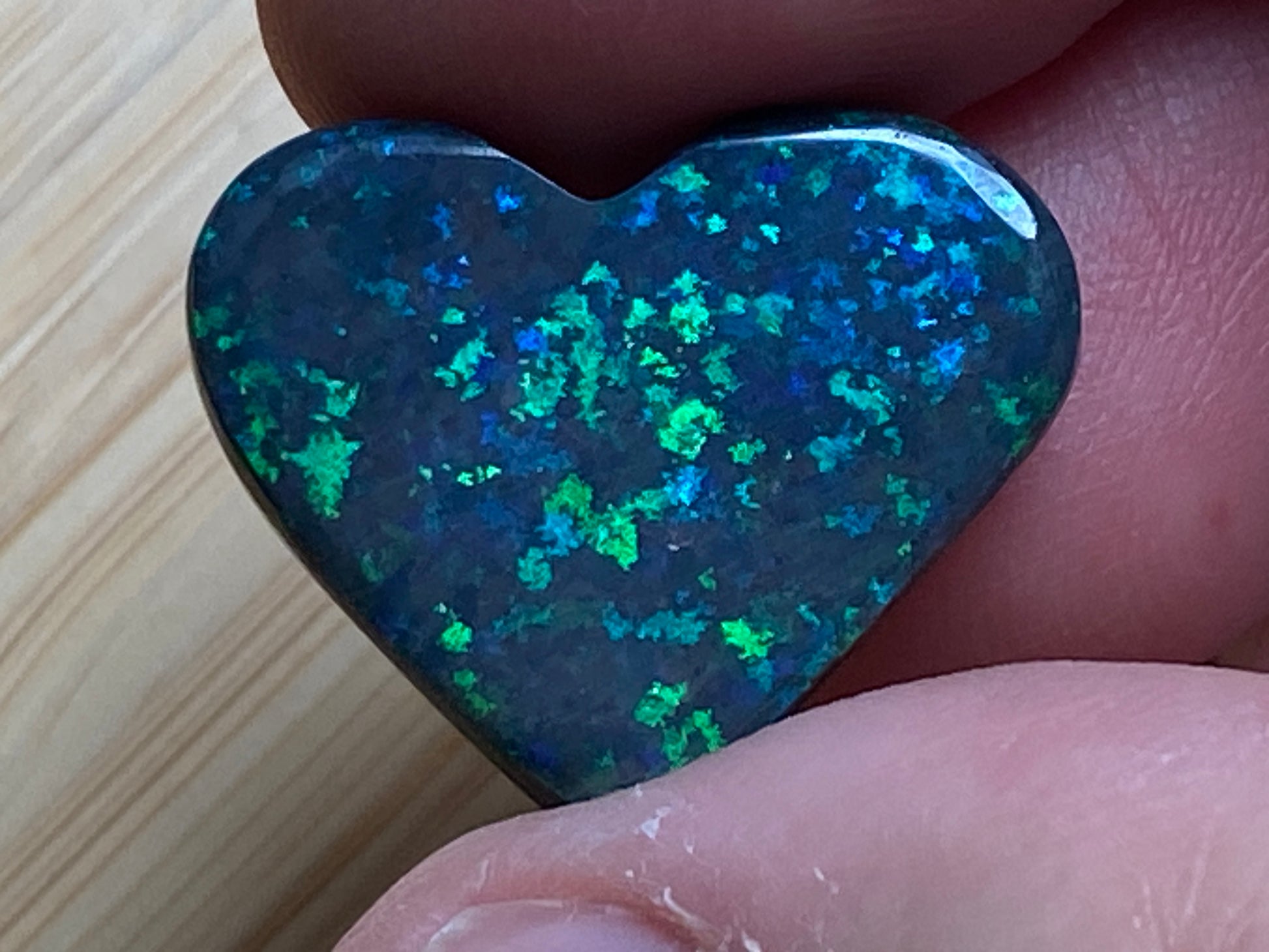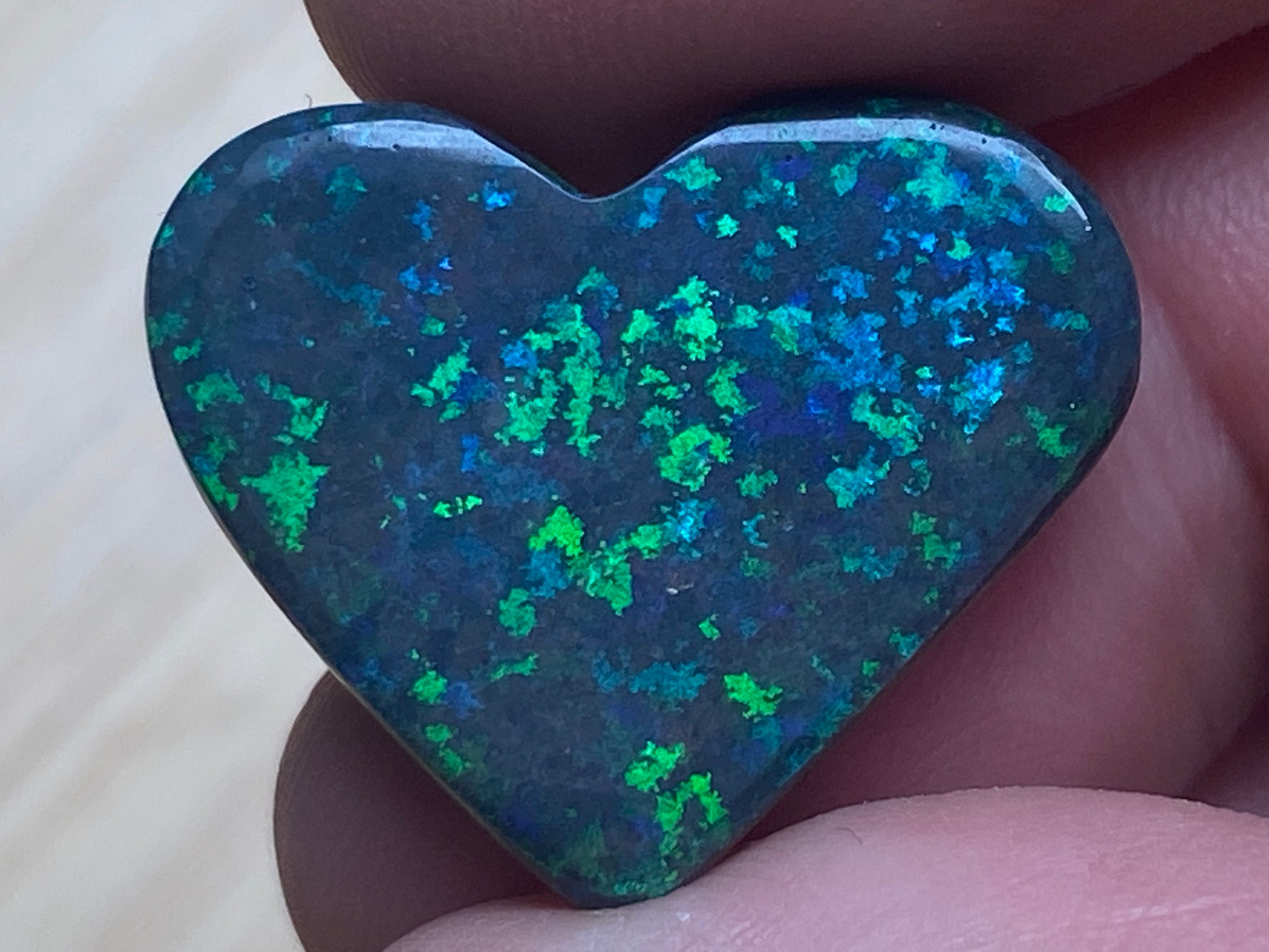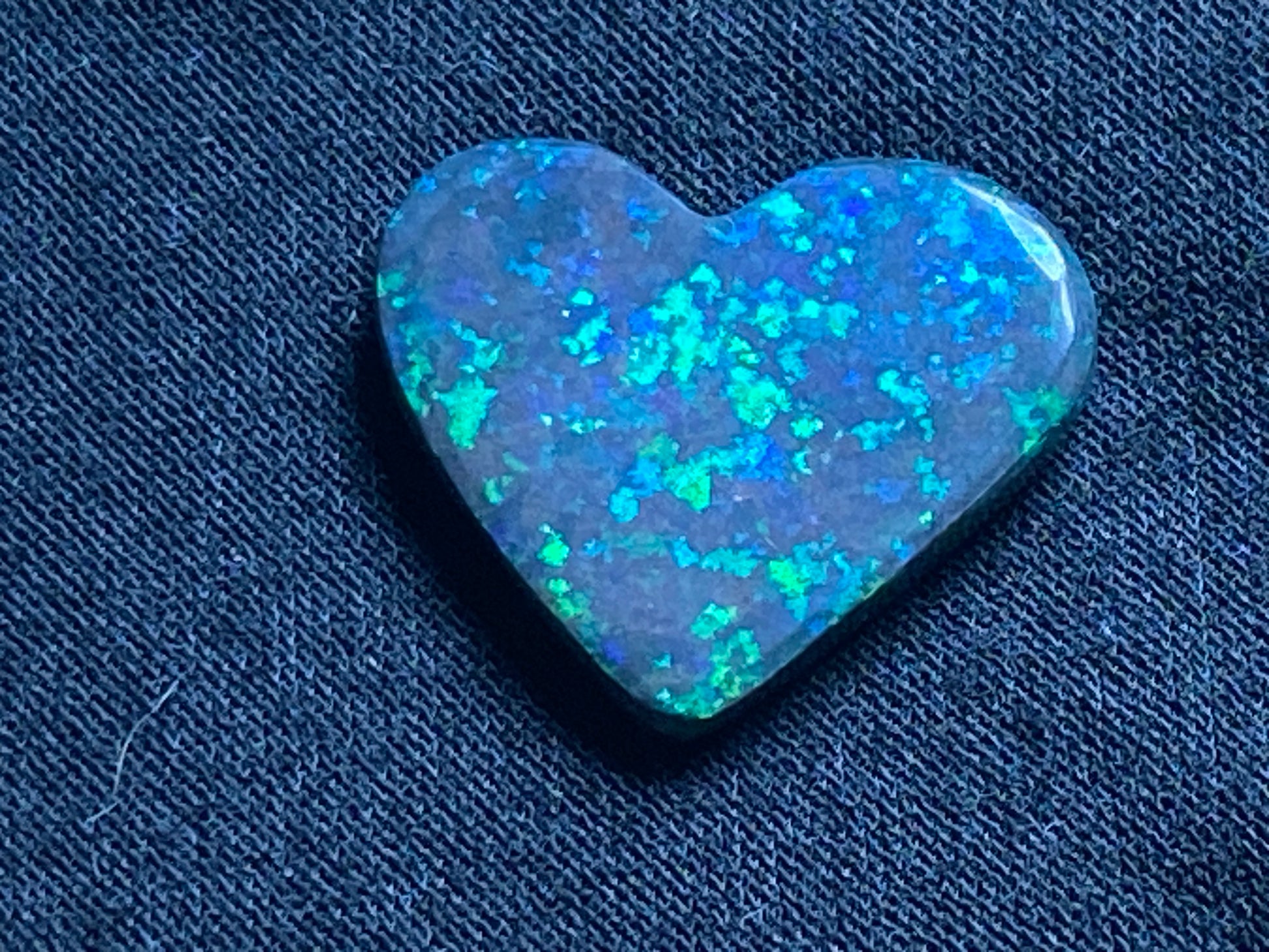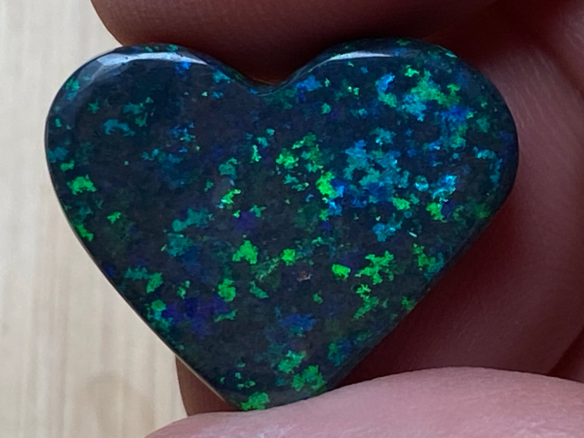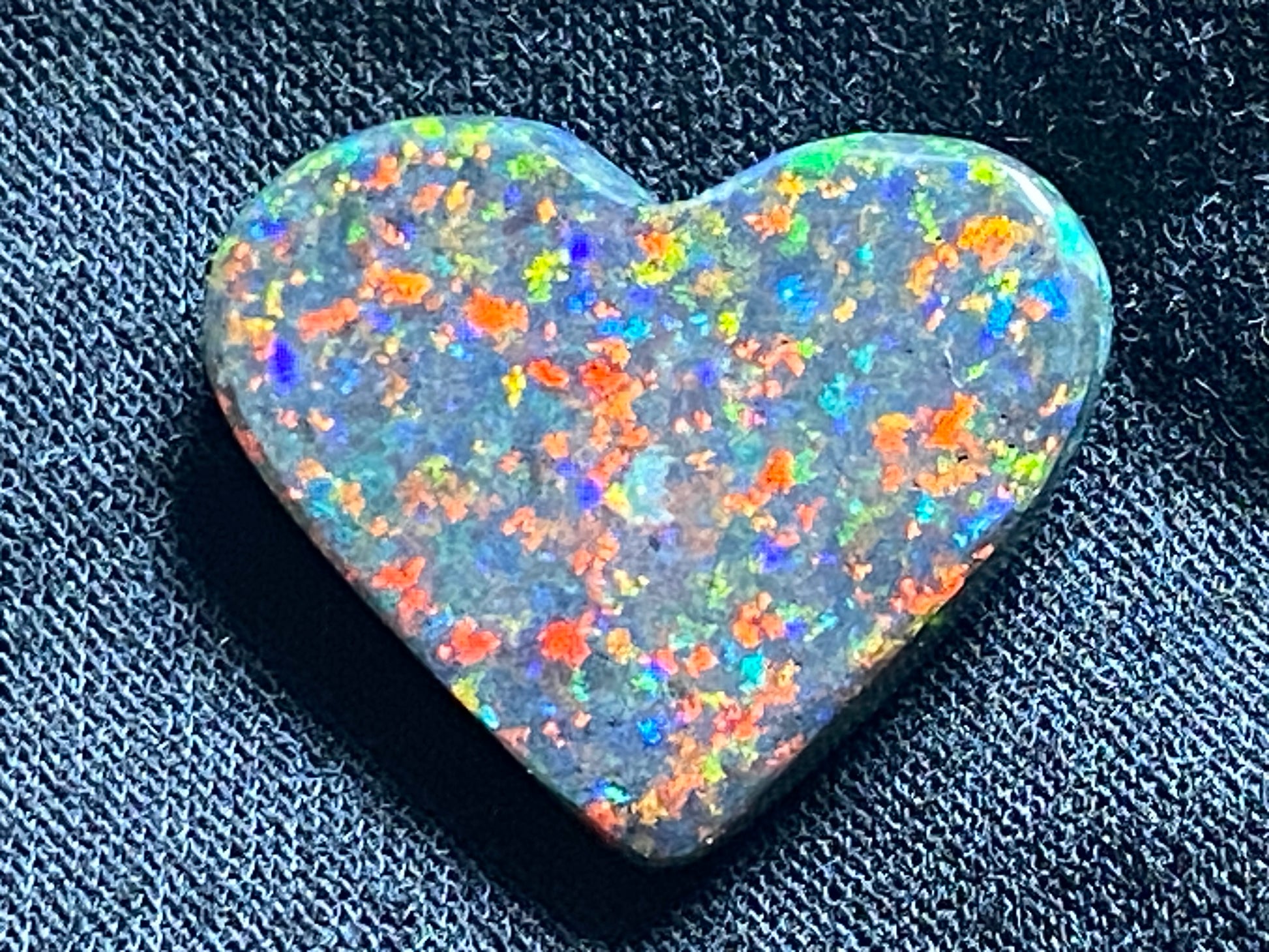 13 Carats, Black Andamooka Matrix Opal Heart, AAA Grade, Ready To Set, Double Sided Bling. Magnificent rainbow of colours. Super bright. 22x18x4.8mm. It is truely a show off piece hard to pick which side is better the red or the blue green. This is as good as Matrix opal gets. Photos don't do it justice.