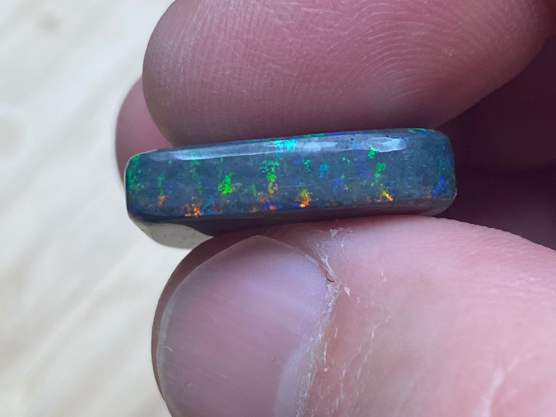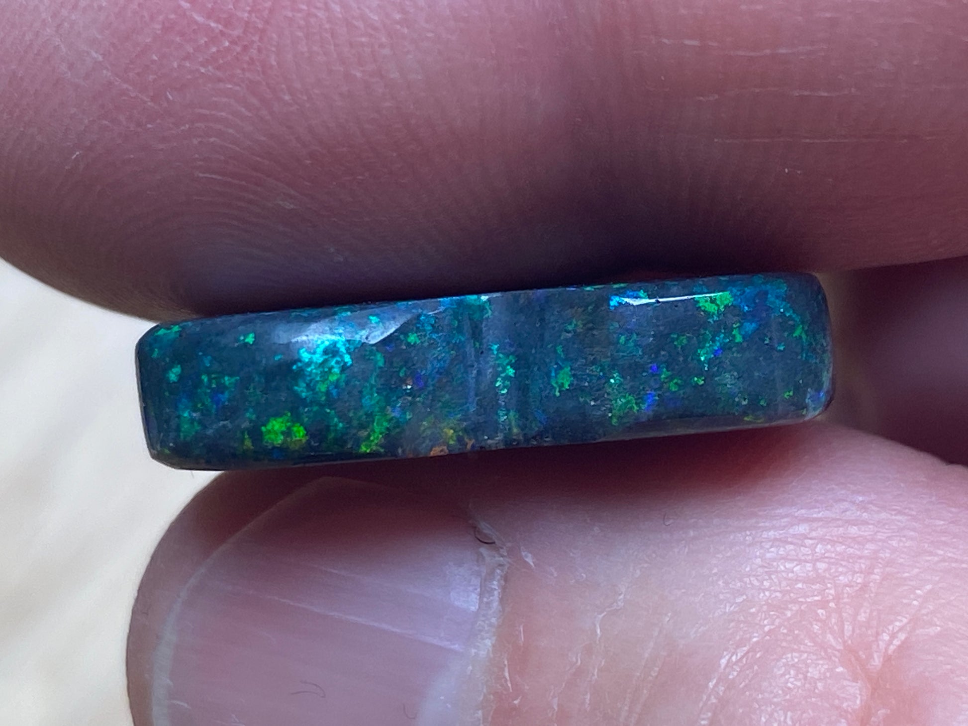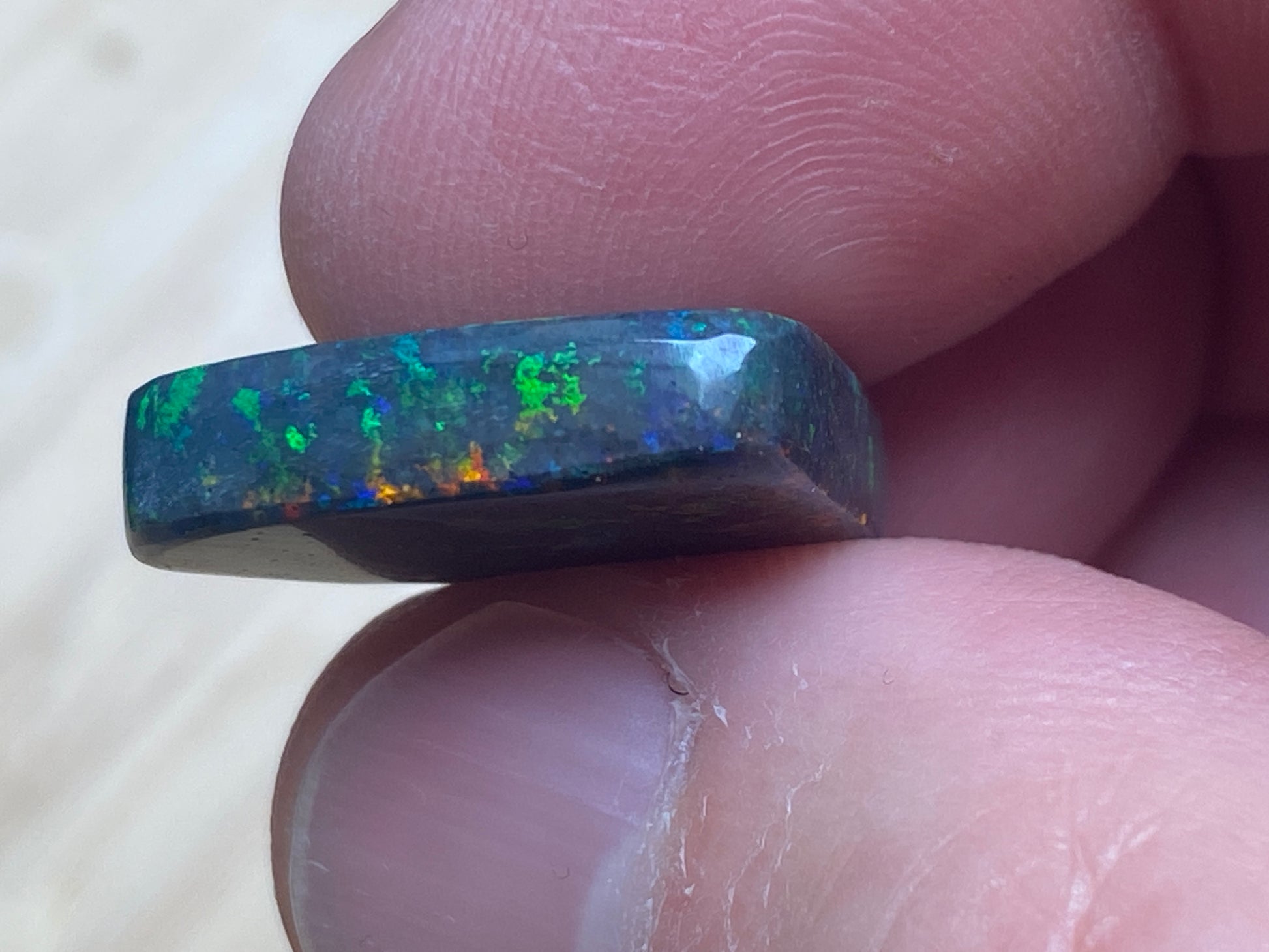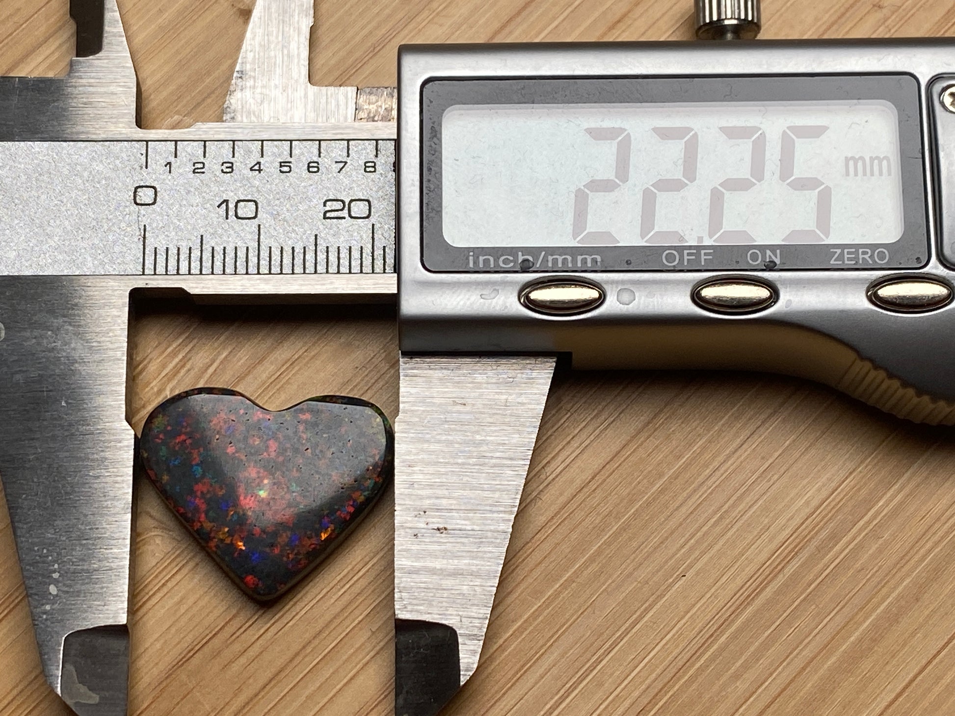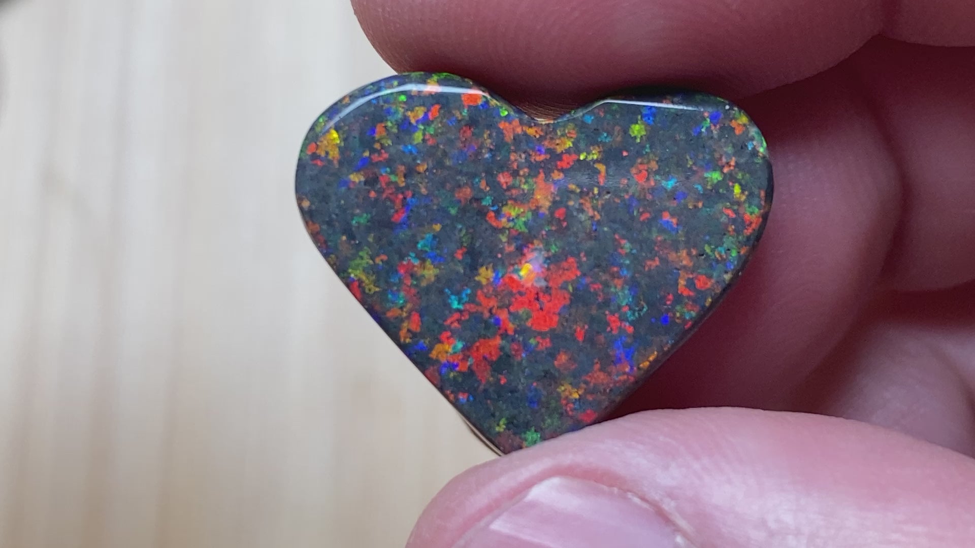 13 Carats, Black Andamooka Matrix Opal Heart, AAA Grade, Ready To Set, Double Sided Bling. Magnificent rainbow of colours. Super bright. 22x18x4.8mm. It is truely a show off piece hard to pick which side is better the red or the blue green. This is as good as Matrix opal gets. Photos don't do it justice.