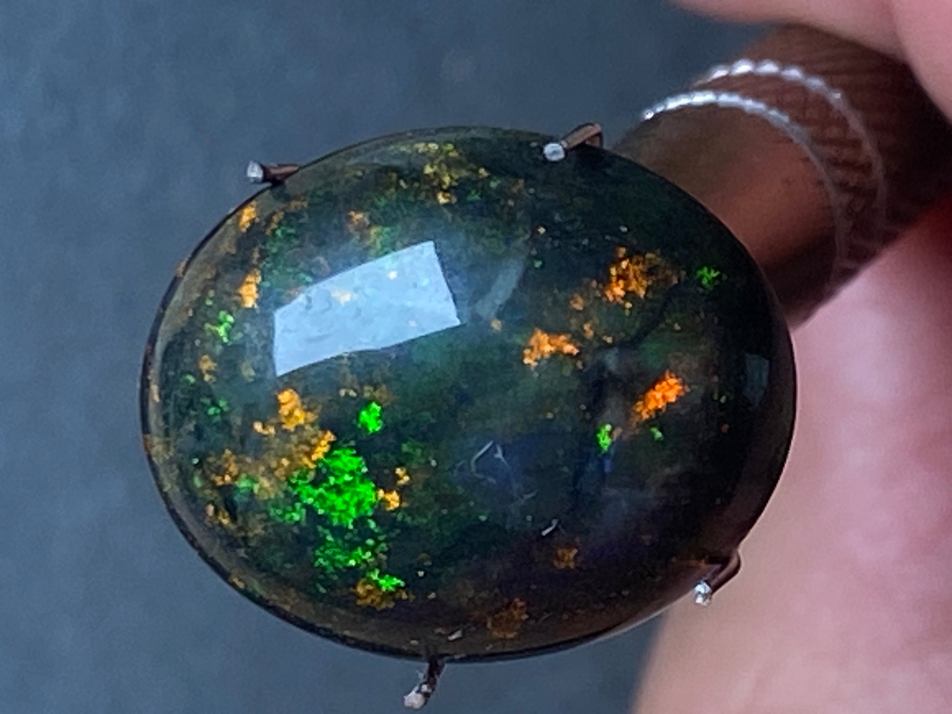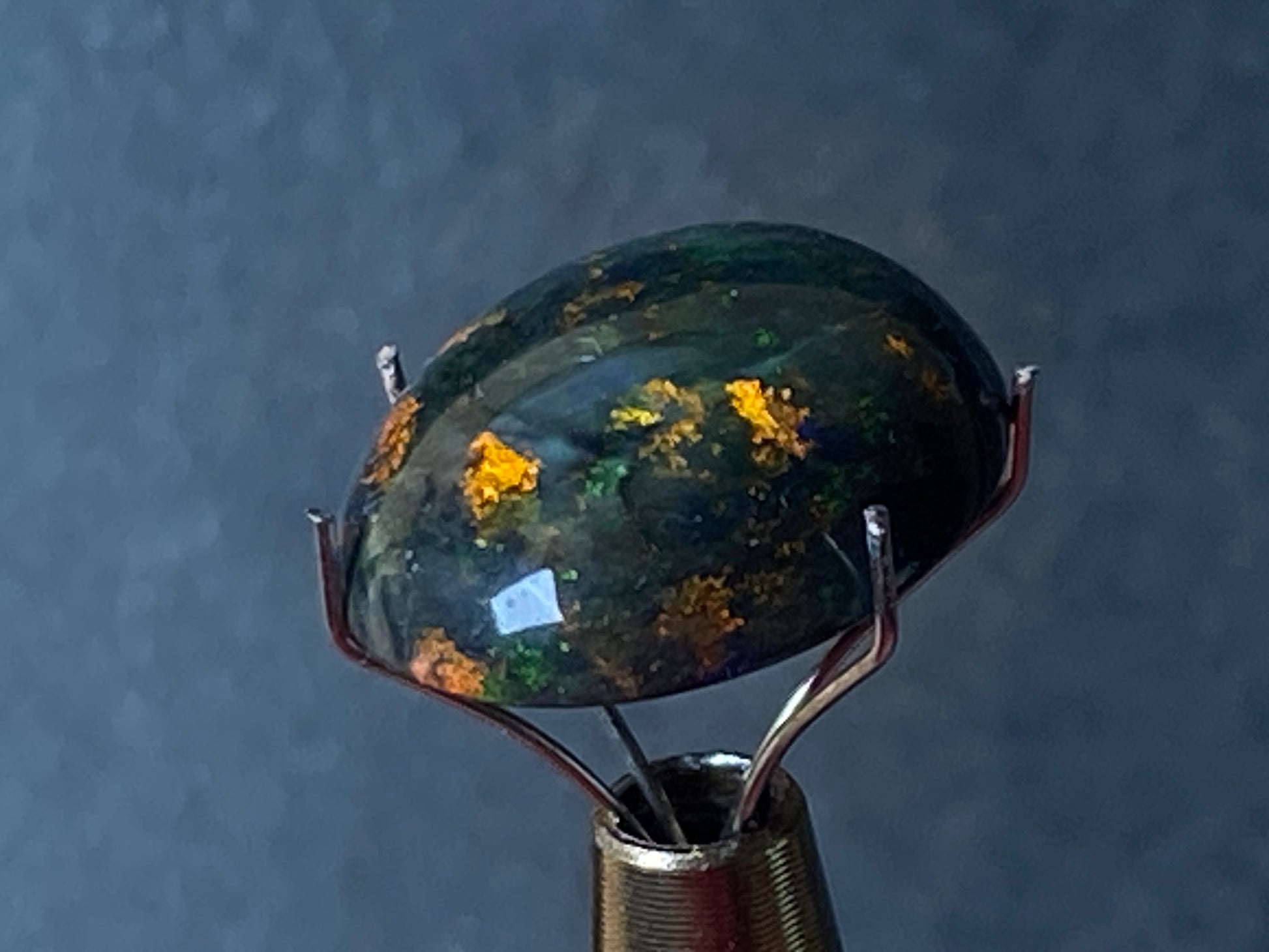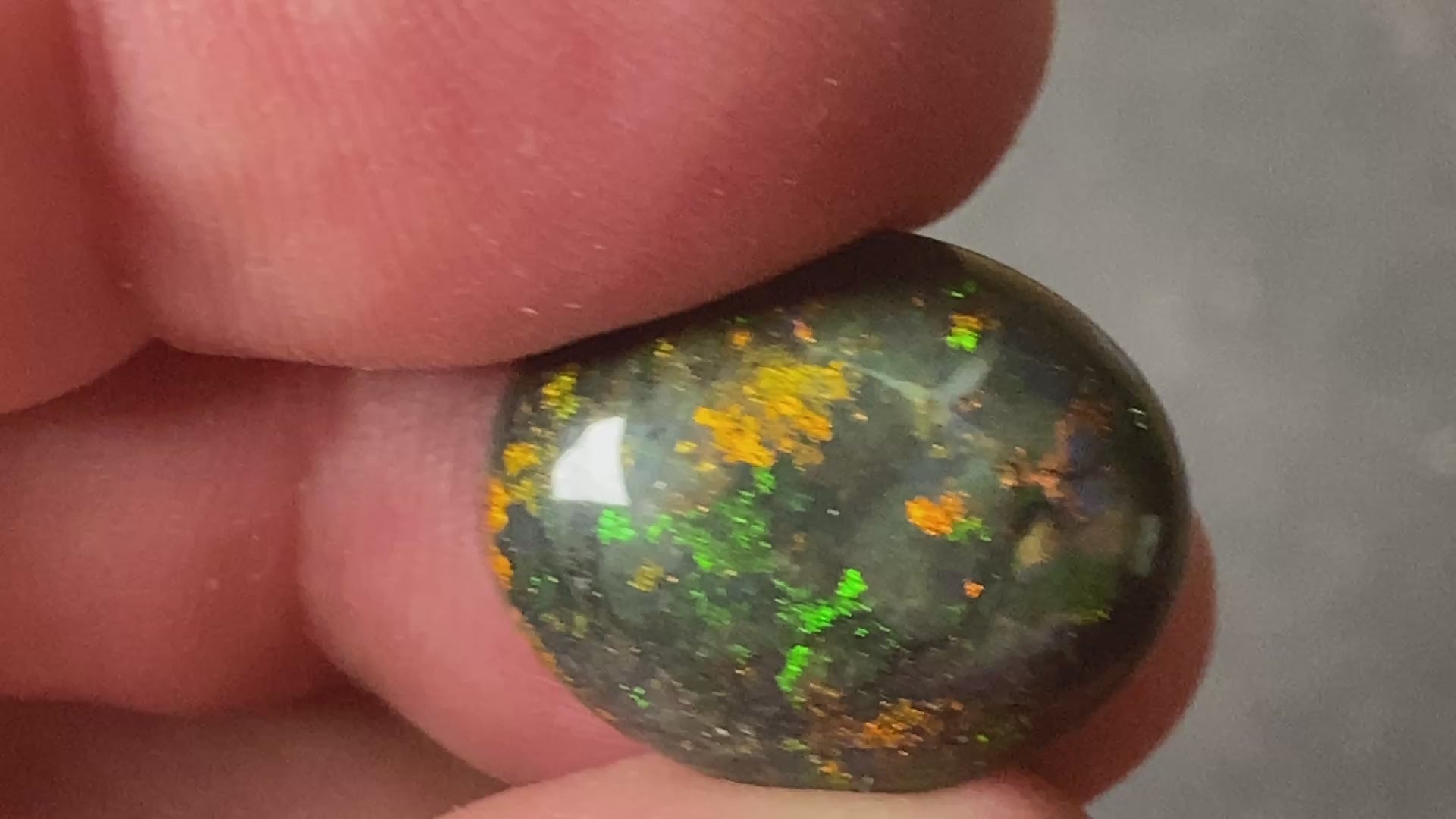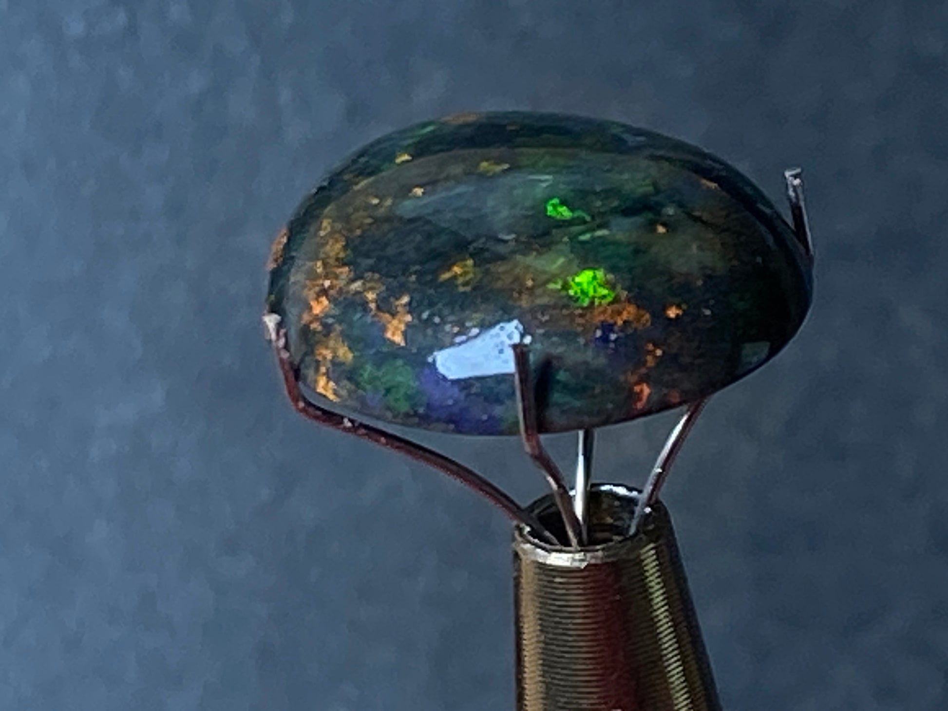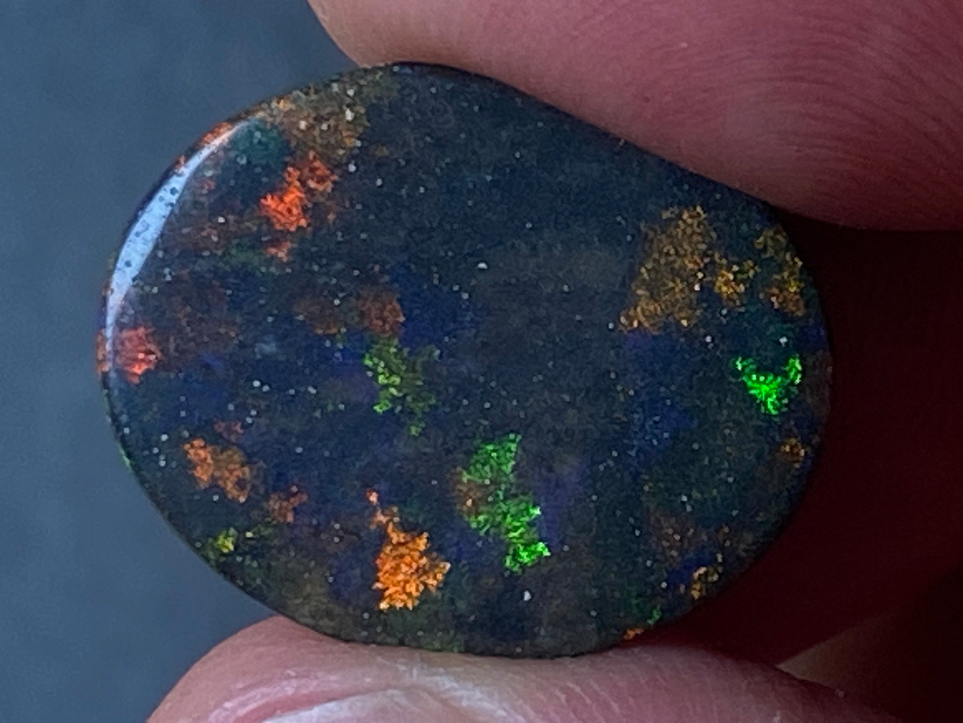 9.4 Carats, Australian Polished Black Boulder Matrix Stone, Full Colour Spectrum. Stunning display of colours on black background. Reds, Greens, Orange, Gold. Looks like a galaxy. Ready to set with high dome and great size of 25x15x5mm oval. This will make a spectacular jewellery specially if set in gold with the dark appearance and those deep colours.